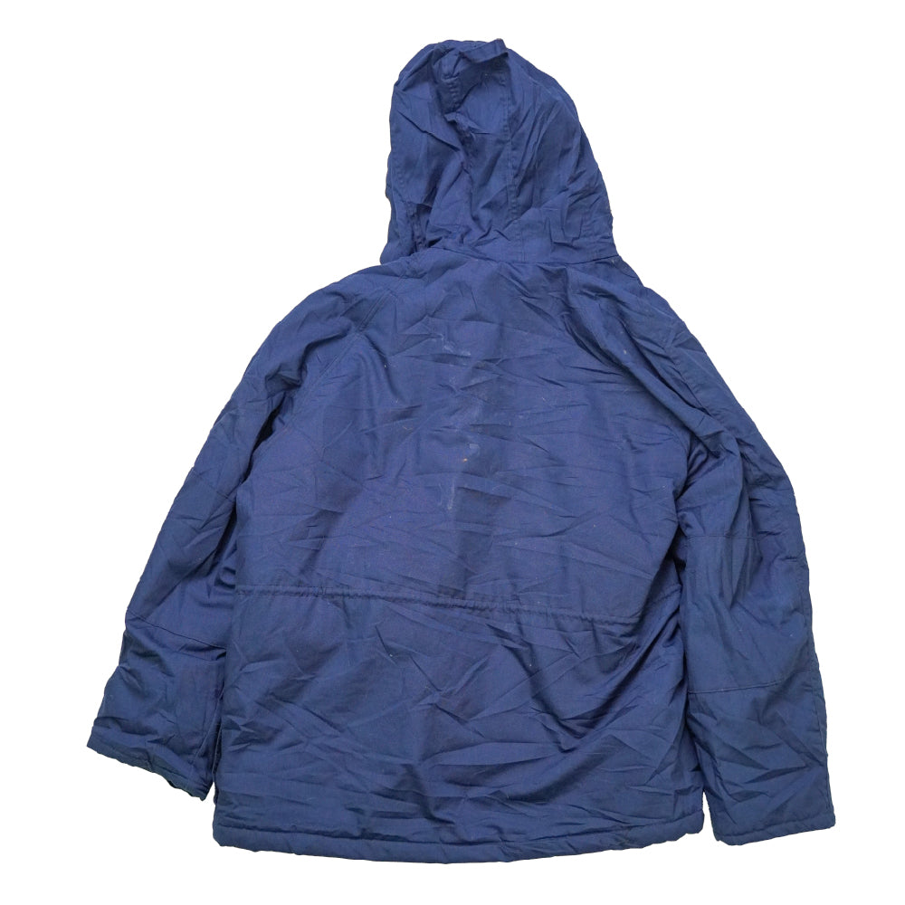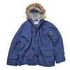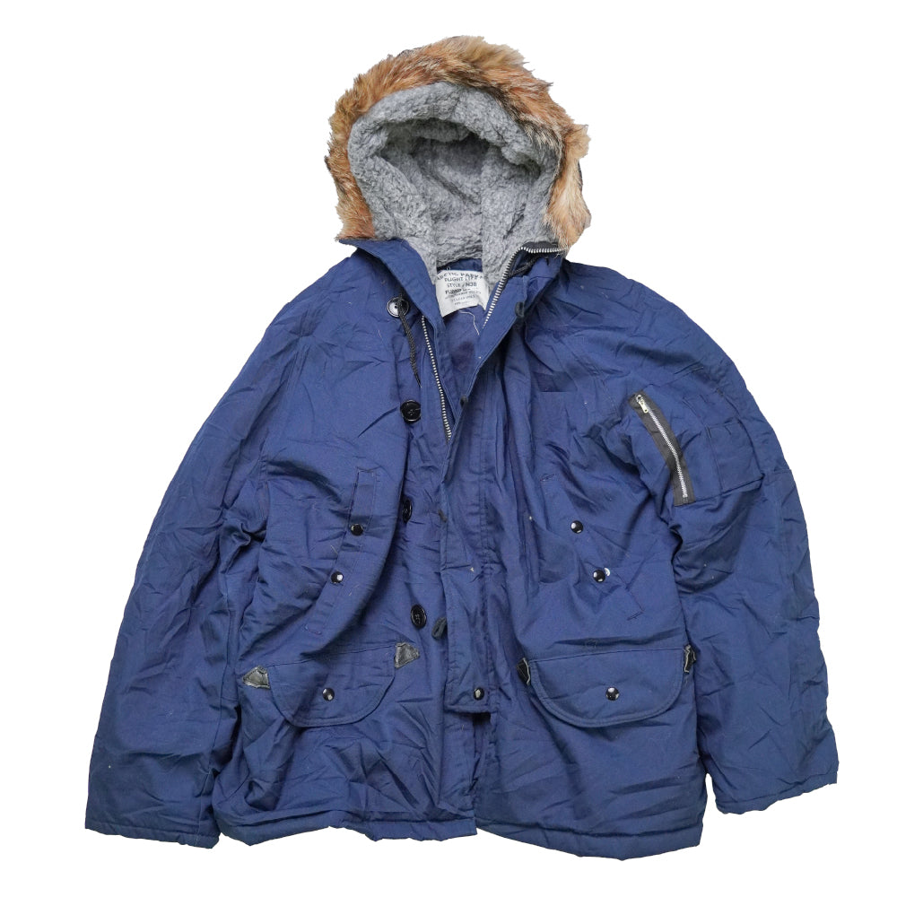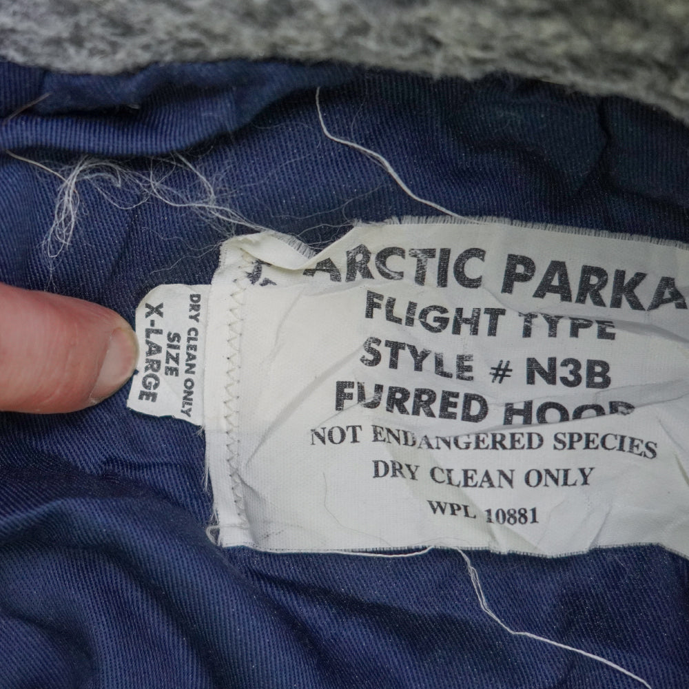 Alpha Industries N-3B “Snorkel” Arctic Parka in insulated nylon construction with a fur-trimmed hood. Features classic snorkel-style hood design and utility pocket detailing. Tagged XL. Some marks on the back that may improve with cleaning.