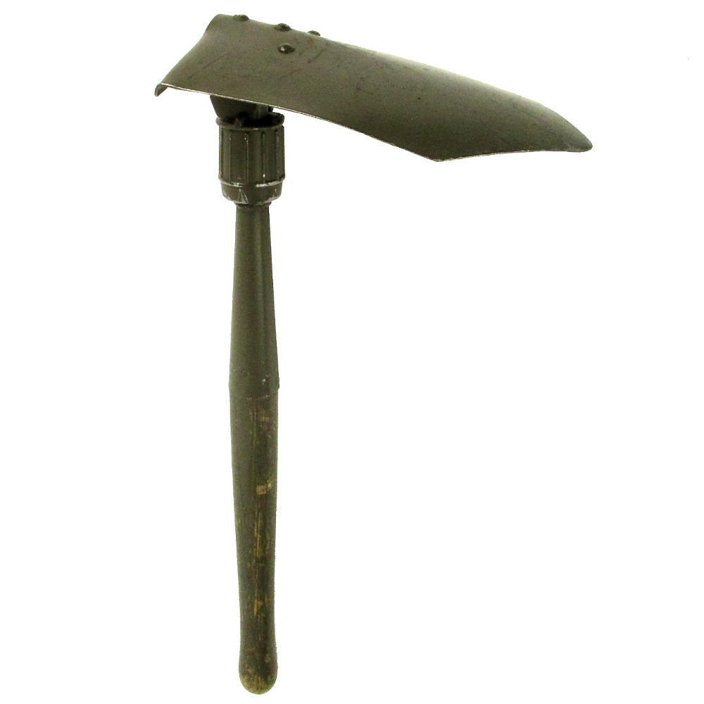 This solid folding shovel comes from the Austrian Army. A robust wooden handle and metal shovel has allowed this to last years and years. Carrying on from the design of the M43, this shovel has a tri-folding head, making for great versatility. Included with this shovel is a camouflage cover, originating from the late 50's to 60's. This camouflage is referred to as "pea pattern" in English or "K4" as the Austrian soldiers nicknamed it.