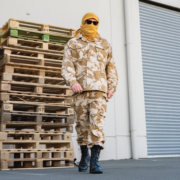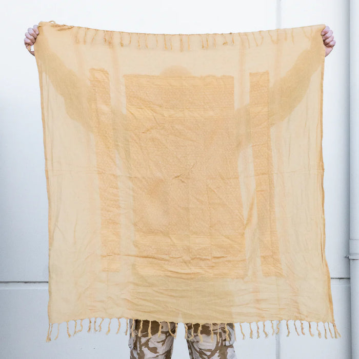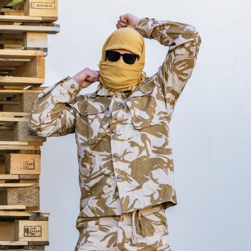 Traditional shemagh scarf, part of the British military desert kit. Multiple variations for wearing/using this versatile accessory. Shemaghs are useful for protecting the wearer's neck and face, breaking up your outline, and concealing weapons.