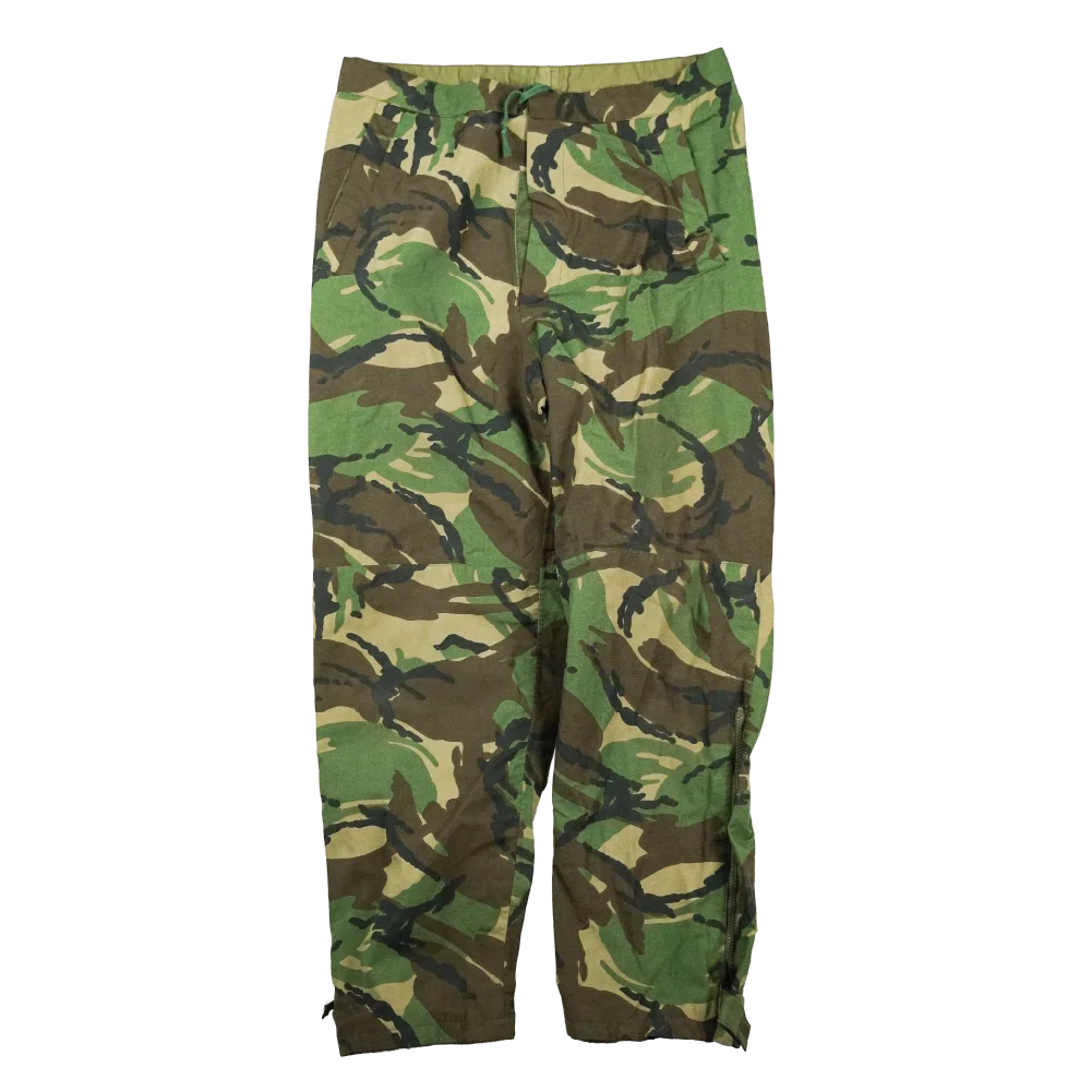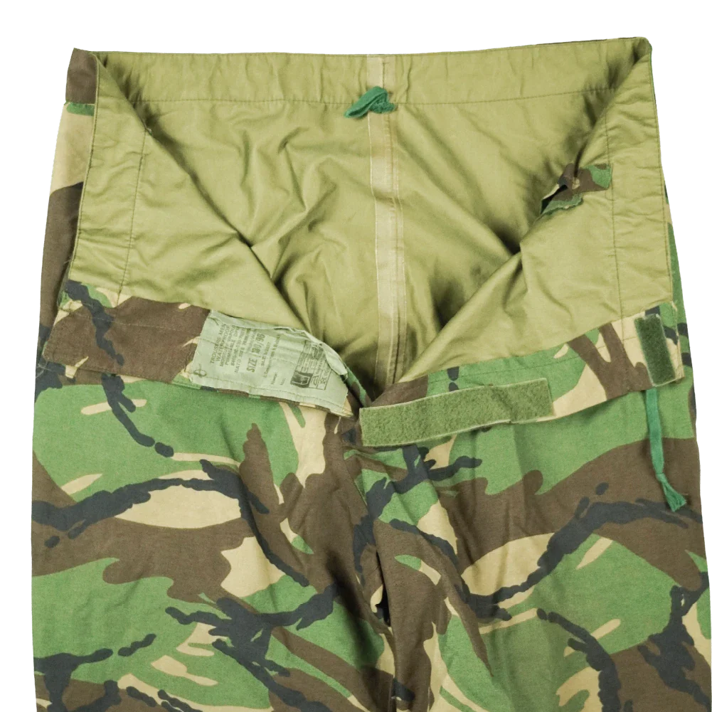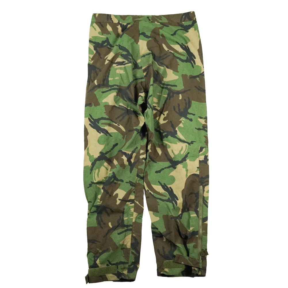 British military surplus MVP rain trousers designed as an over-trouser layer. Constructed from Moisture Vapour Permeable fabric, with side access openings at the waist and full lower-leg zip openings for ease of wear over boots and trousers.