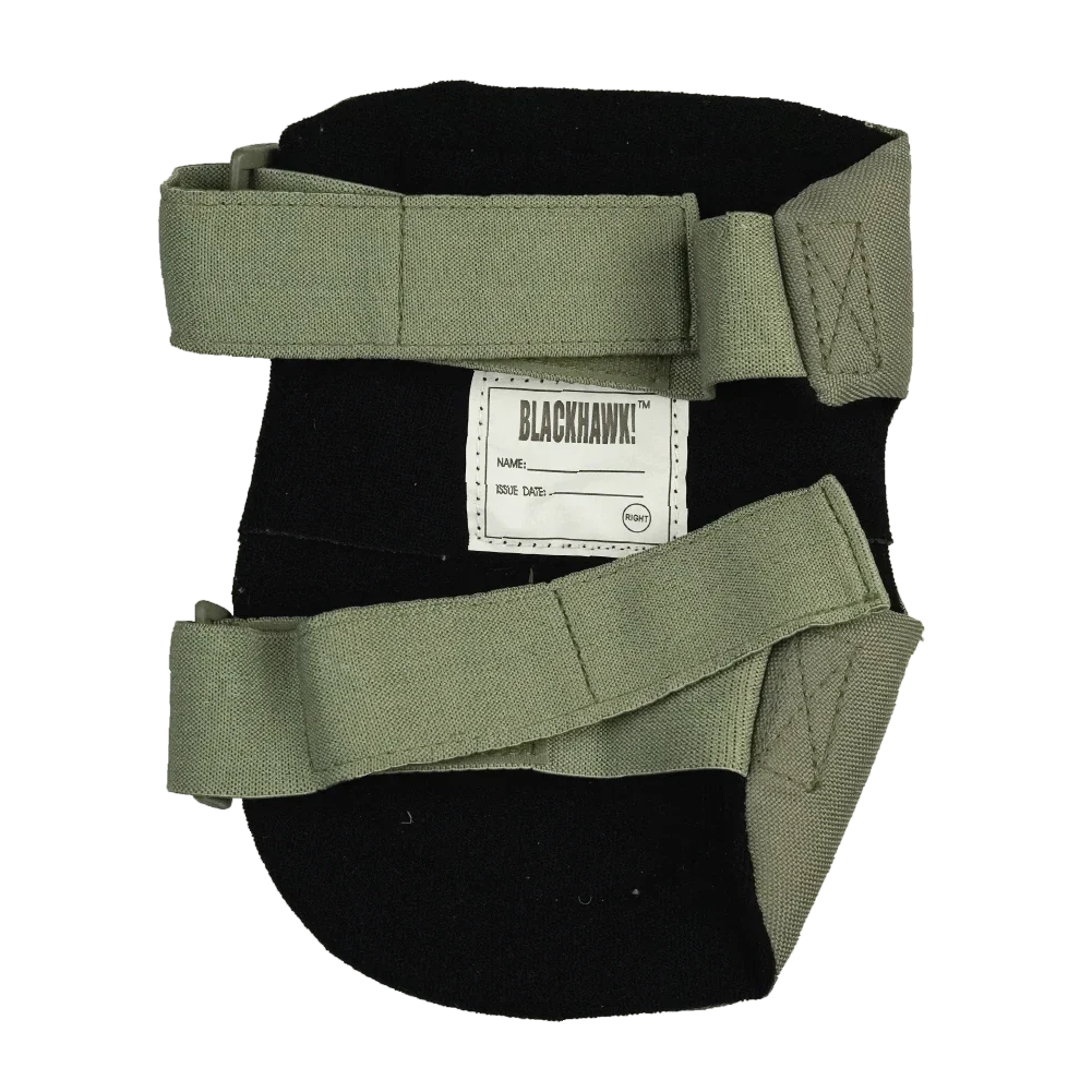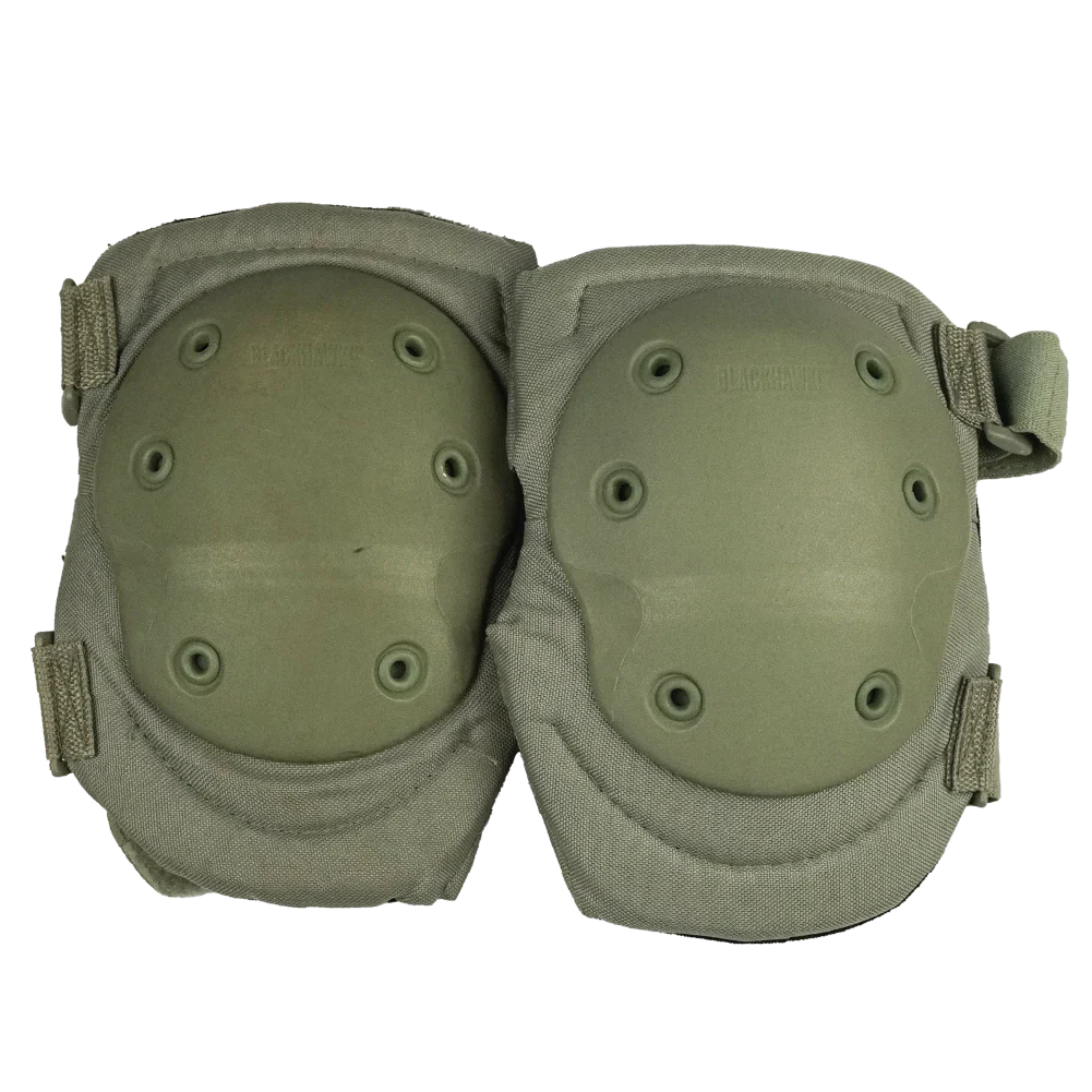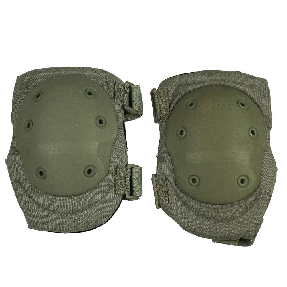 British issue Blackhawk V2 knee pads in olive colour. This is a matched pair of hard-shell knee pads with internal padding and adjustable elastic retention straps.