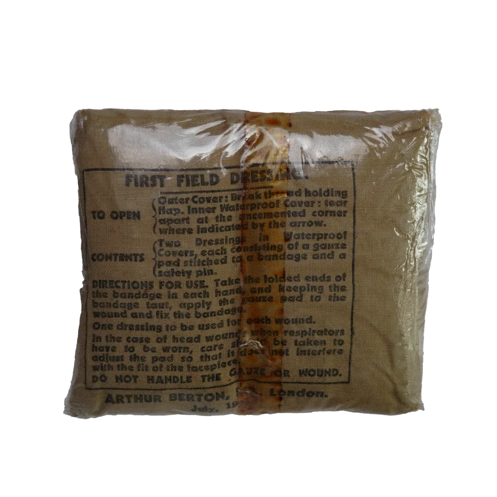 WW2 British issue field dressing from the M1937 Web Harness Set. Brown cotton outer packaging, manufactured by Johnson & Johnson Ltd. in Sydney for the British military. Most remaining stock is dated 1943 and comes in original unopened packaging. For display purposes only.