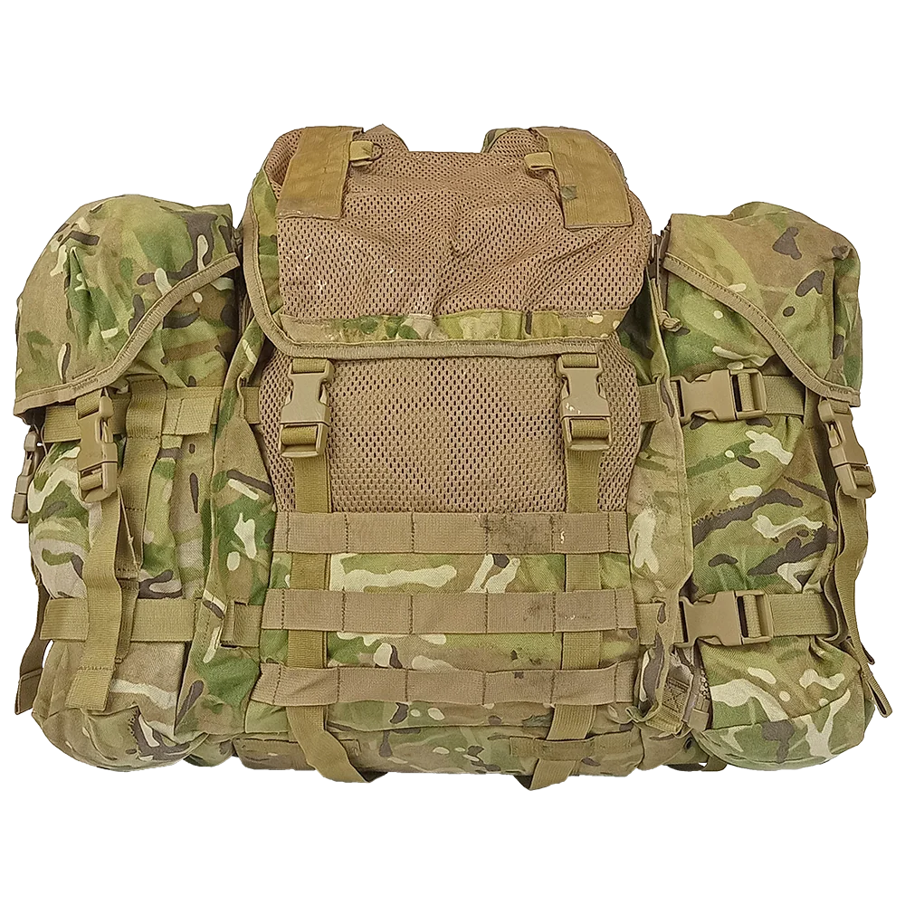 The British Army ECM (Electronic CounterMeasures) Lightweight Bergen made by Karrimor SF is a ~45‑litre nylon Cordura patrol pack made with some unique features for British soldiers lugging around electronic gear.