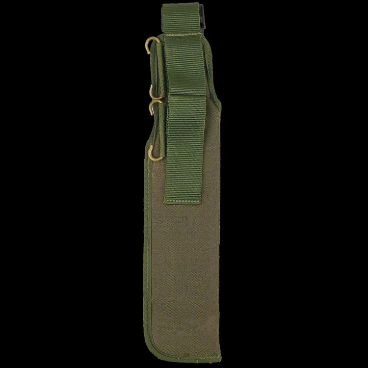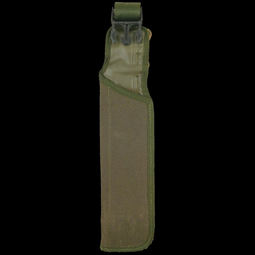 This handy fellow is in classic olive drab and attaches to a PLCE belt with belt loops and Pattern 58 style C-hooks. The two loop/hook combos enable this to be work higher or lower on the belt. A rubberised interior for grip and the male clip attached to your bayonet's scabbard. Fill out your PLCE rig and keep the pointy things safe!