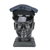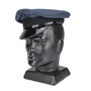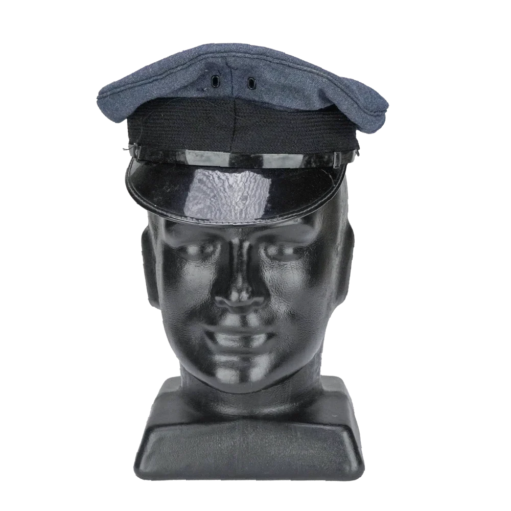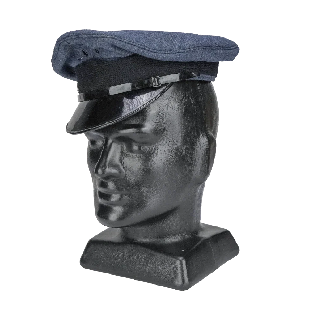 British RAF peaked cap with a structured fabric crown and stiff glossy peak. Features a black band and front strap detail with side fittings, along with small ventilation eyelets on the crown.