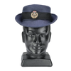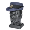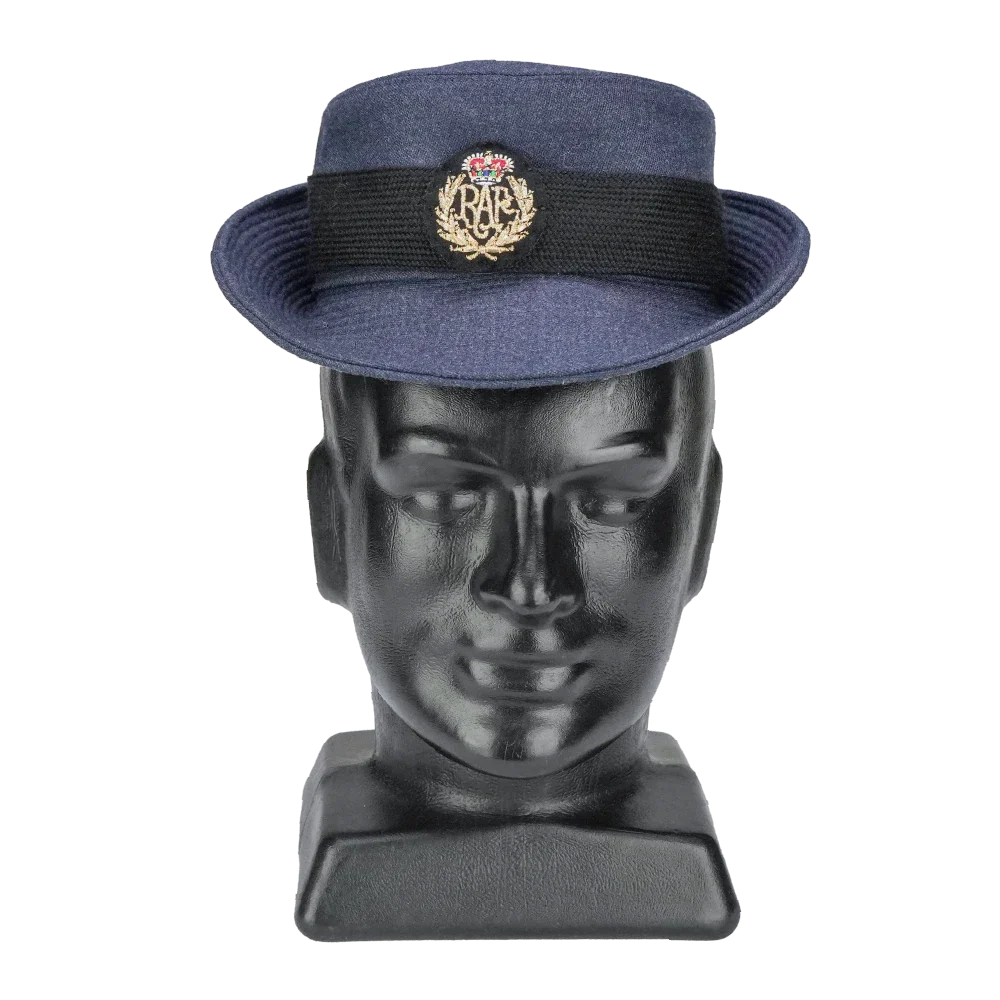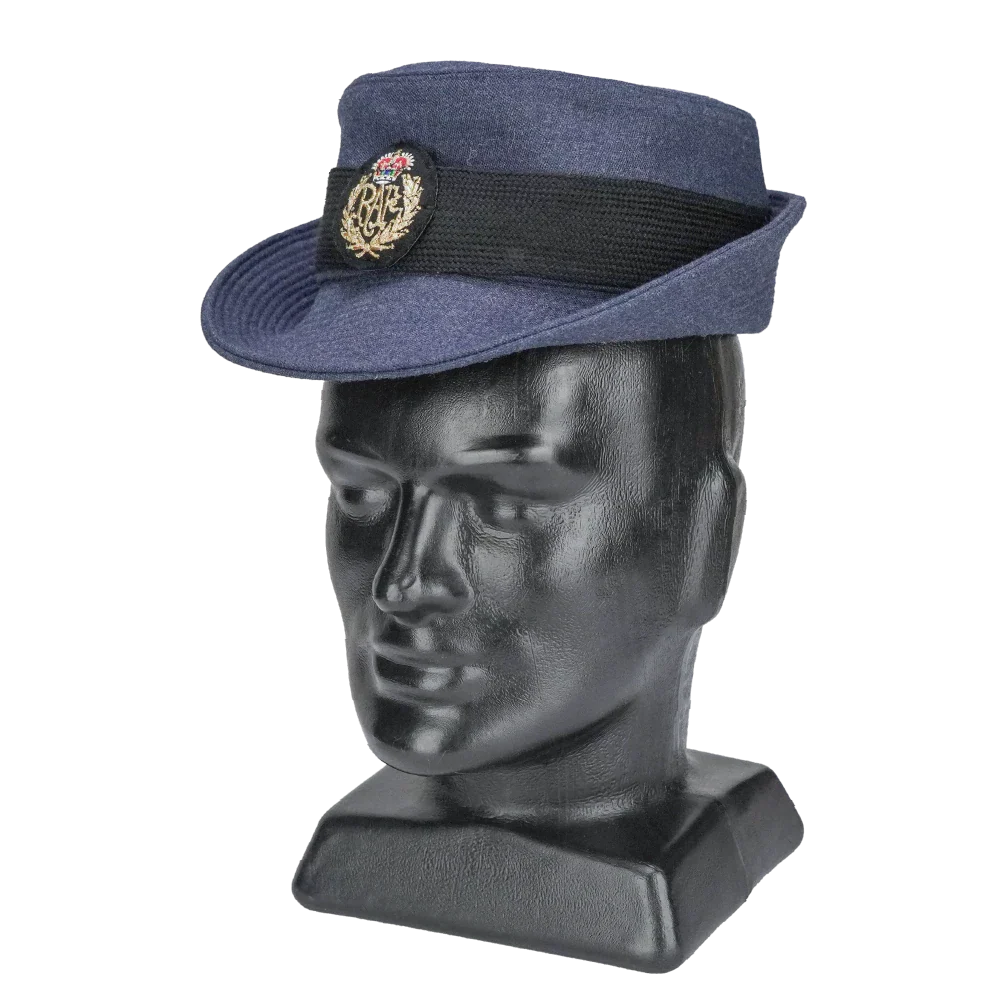 British RAF women's service dress cap with structured crown and short brim. Features a wool outer with internal lining and front-mounted RAF cap badge.