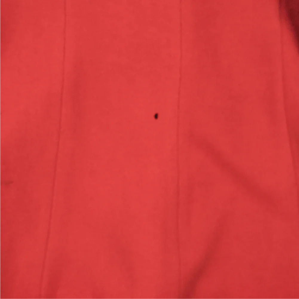 There is a small hole on the lower back, and two buttons are missing from the front, with one spare button attached to the shoulder.