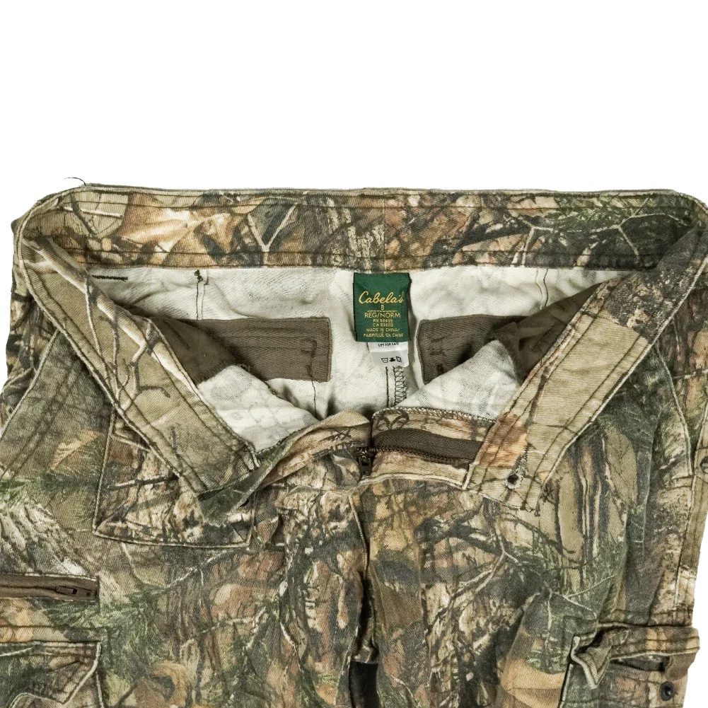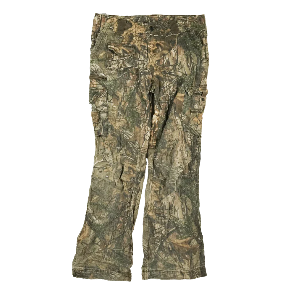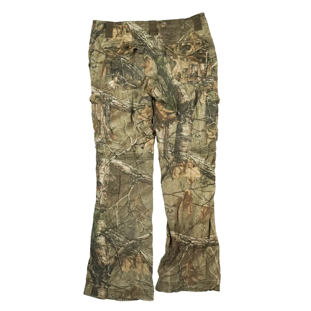 Cabela’s women’s camouflage trousers in a classic woodland-style camo pattern. They feature a practical cut with belt loops and rear pockets, and are constructed for durability.