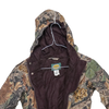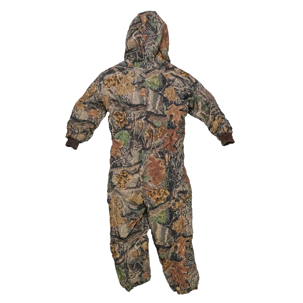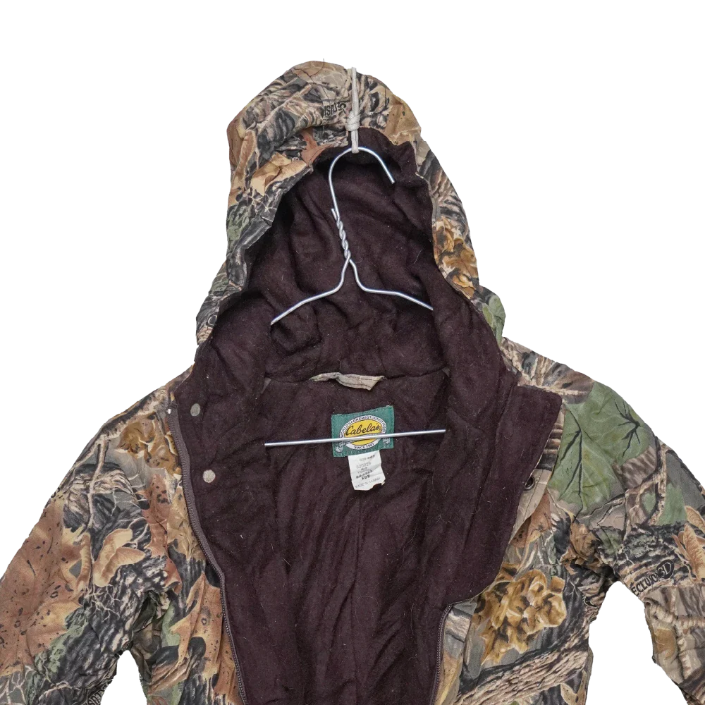 Cabela's Seclusion camouflage coveralls with an attached hood. This one-piece garment features a lined construction and full-body coverall design in a camo pattern.