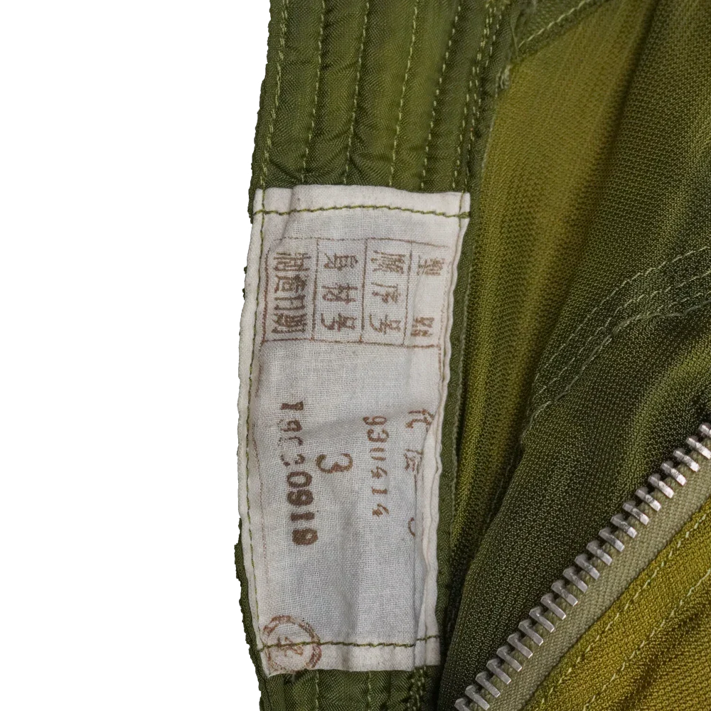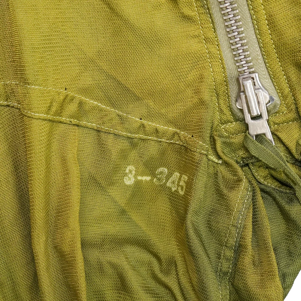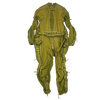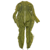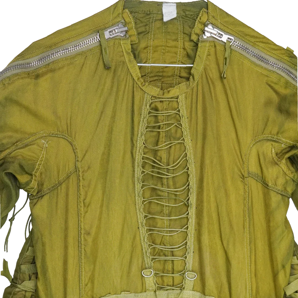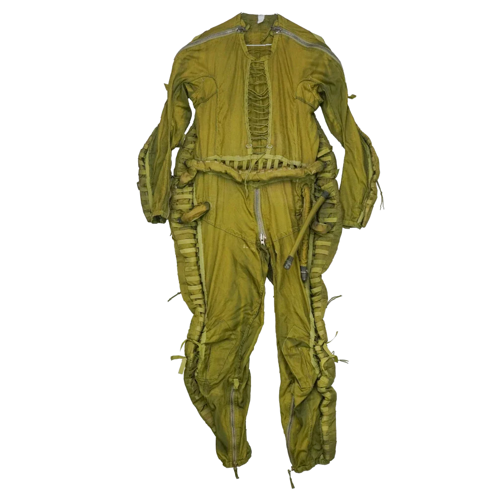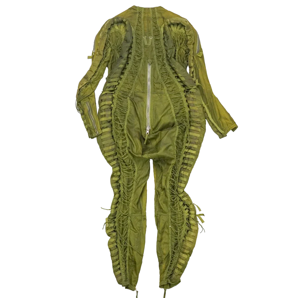 Chinese MIG Pilot DC-4 high altitude pressure suit. Full-body suit in olive green with extensive external lacing channels running along the torso, arms, and legs, plus a central lace-up chest section and multiple heavy-duty zips including shoulders, front, and lower legs. Integrated hose fittings and attachment points are present at the waist area, along with reinforced stitched panel sections throughout.