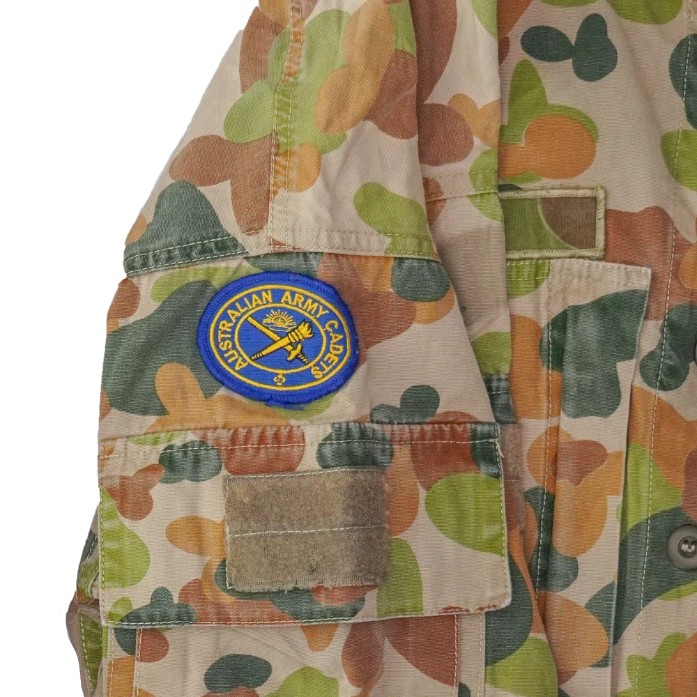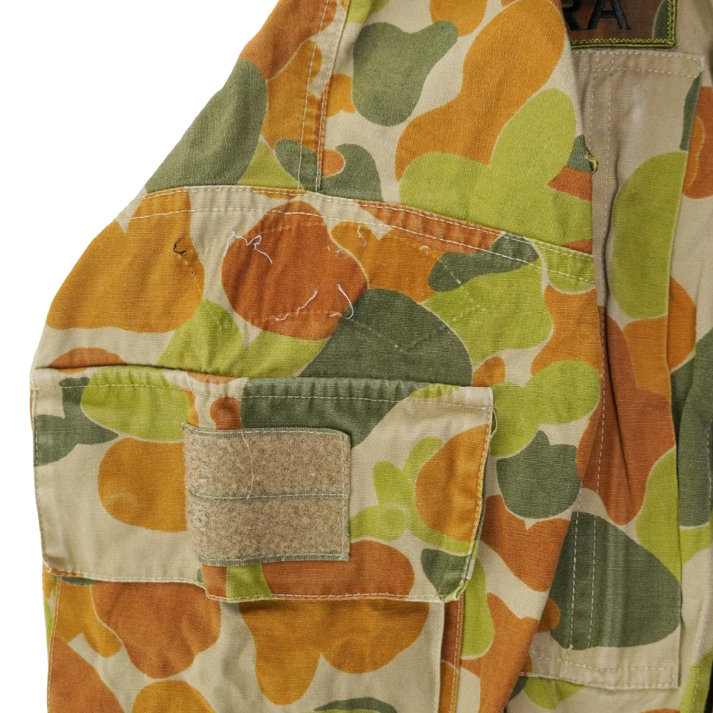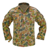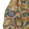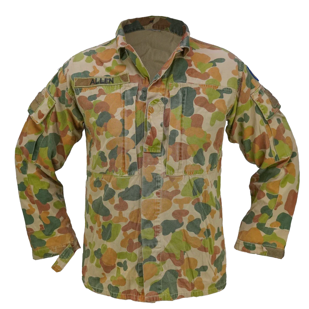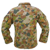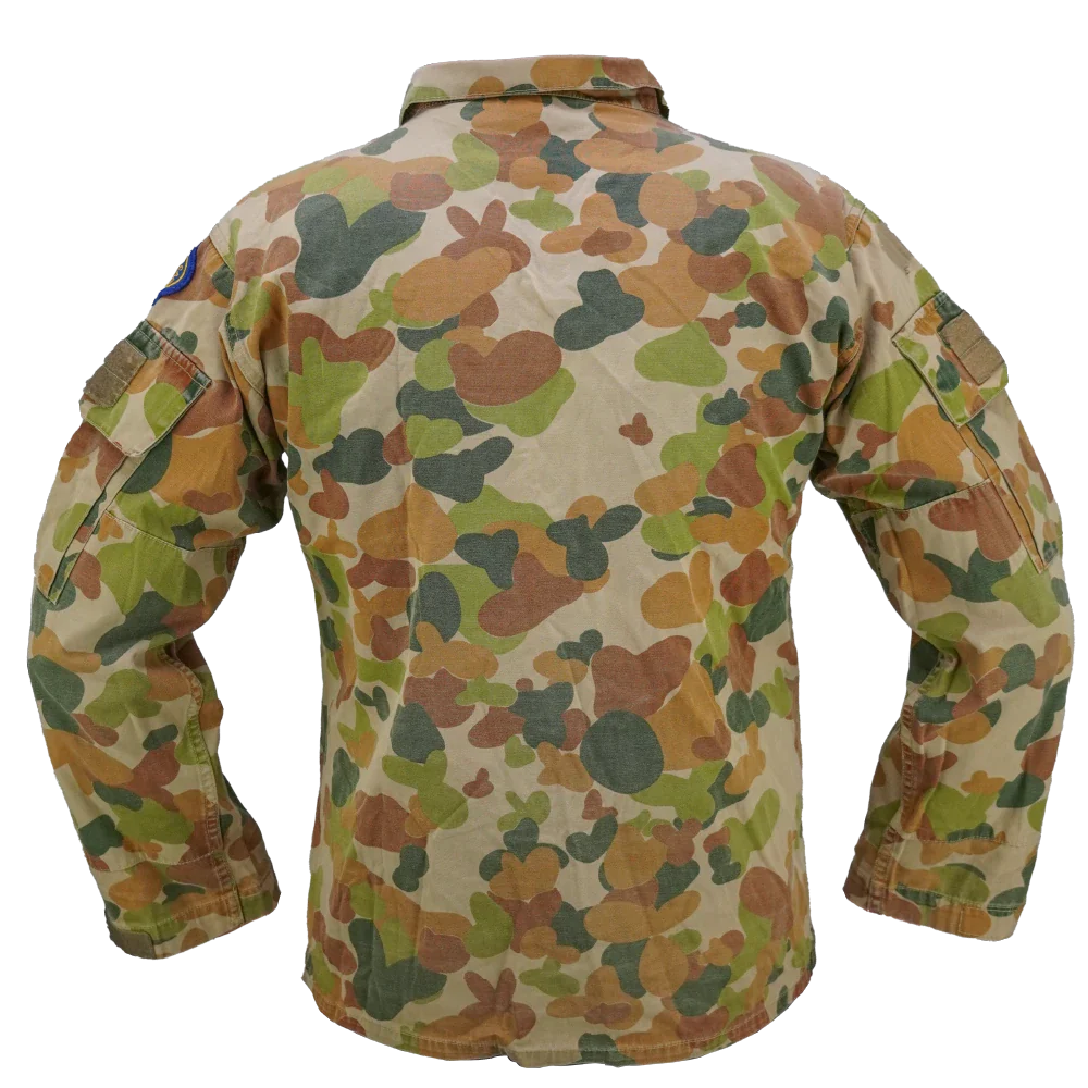 Late DPCU field shirt in Auscam camouflage. Made from 100% cotton with a button front closure, chest pockets with flap covers, and sleeve cargo pockets with hook-and-loop patch panels.