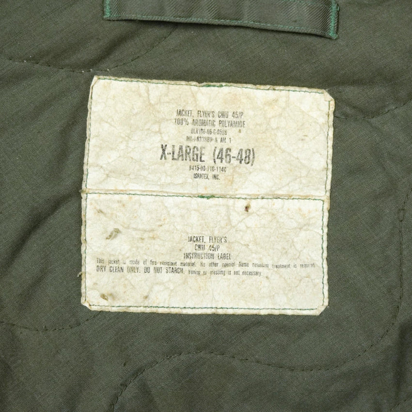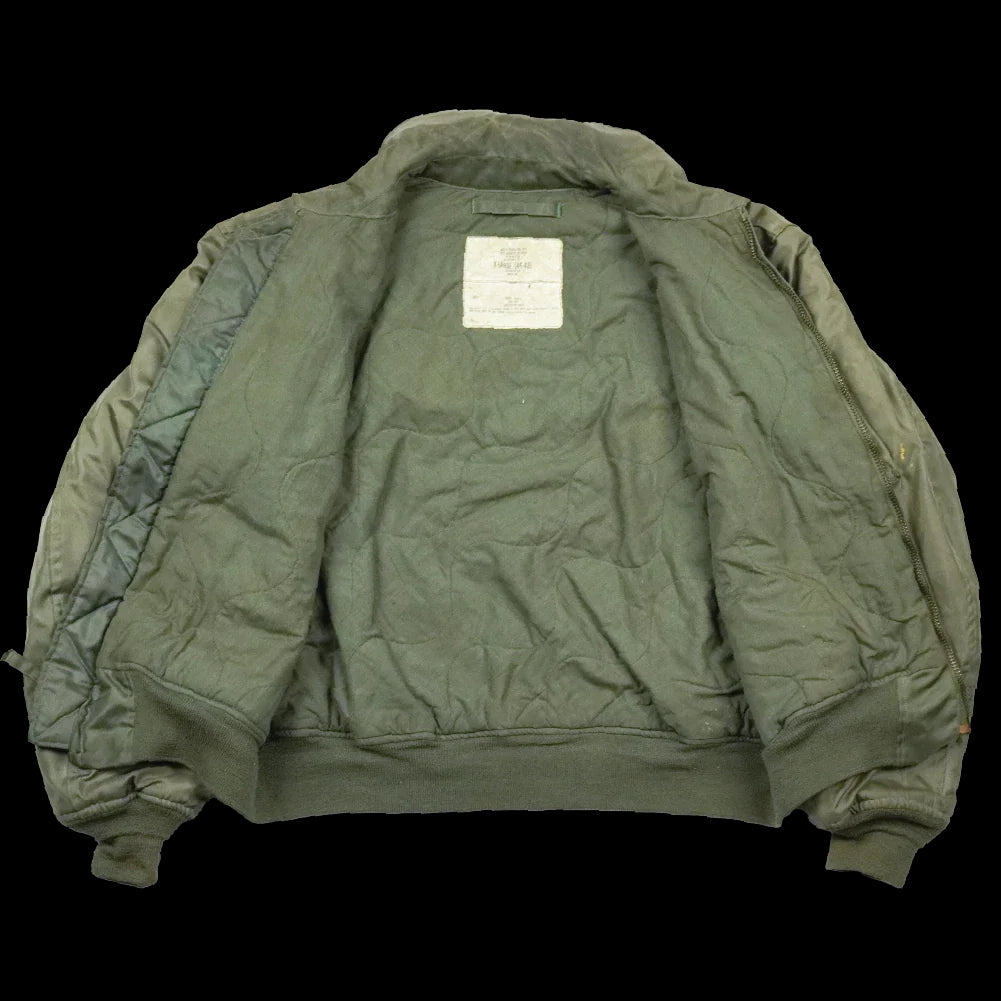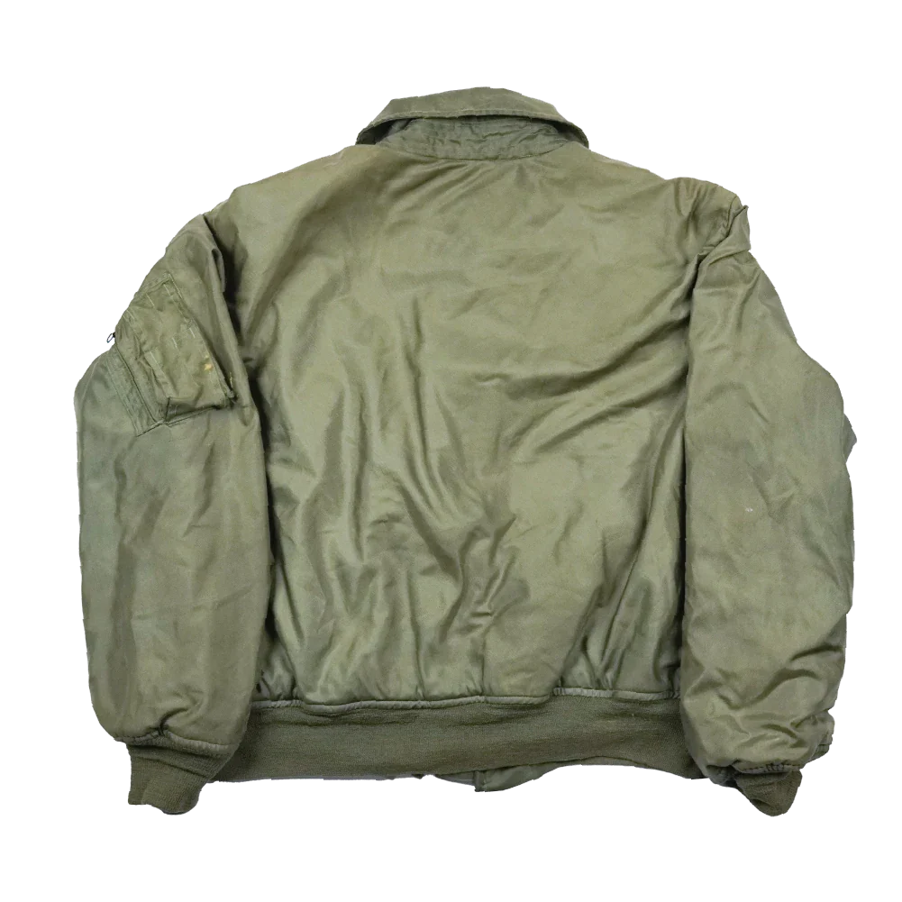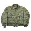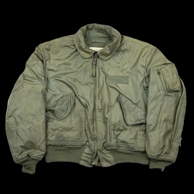 The CWU-45/P men's cold weather flyer's jacket is a U.S. Air Force flight jacket designed for cold conditions. It features a front zipper with storm flap, knit cuffs and waistband, and two large front pockets.