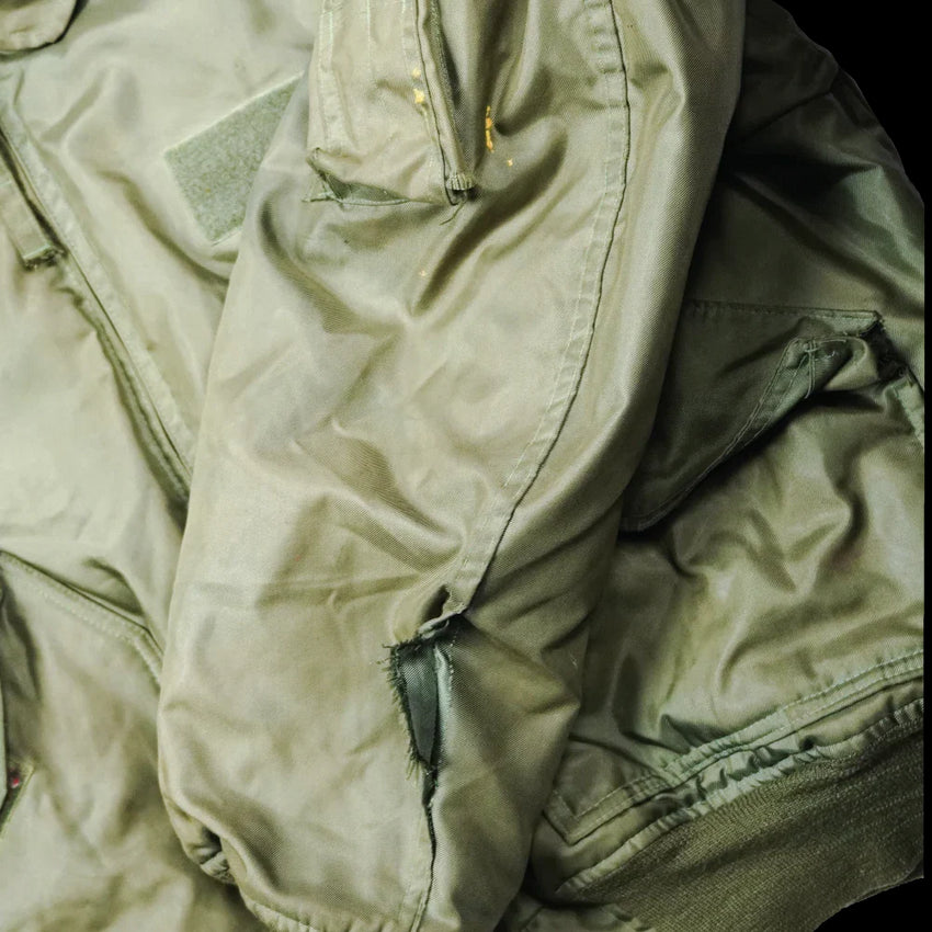 This example is in value grade condition with multiple stains. The zipper is coming unstiched at the base of the jacket, and the stitching has opened up on the left sleeve.