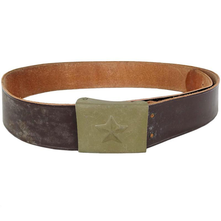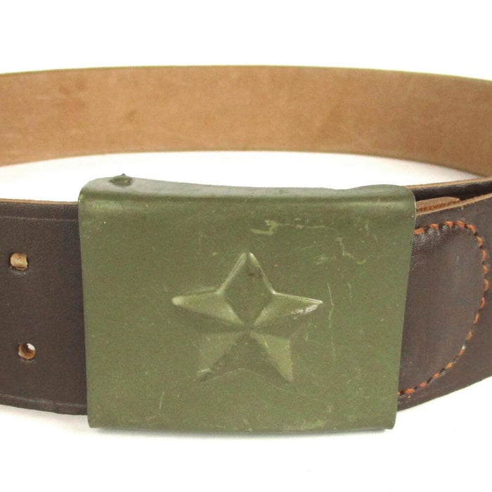 This service belt is surplus of the Army of the Czech Republic. It's dated around the 1980's and is constructed from sturdy leather with a steel buckle. The design is influenced by German service belts seen in the 1970's. An embossed star emblem is a prominent feature on the buckle. There are some scuffs and scratches on the buckle, although it adds to the genuine and vintage feel of the belt. It's a nice piece for a collection and a bold look around the waist.