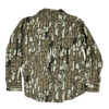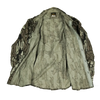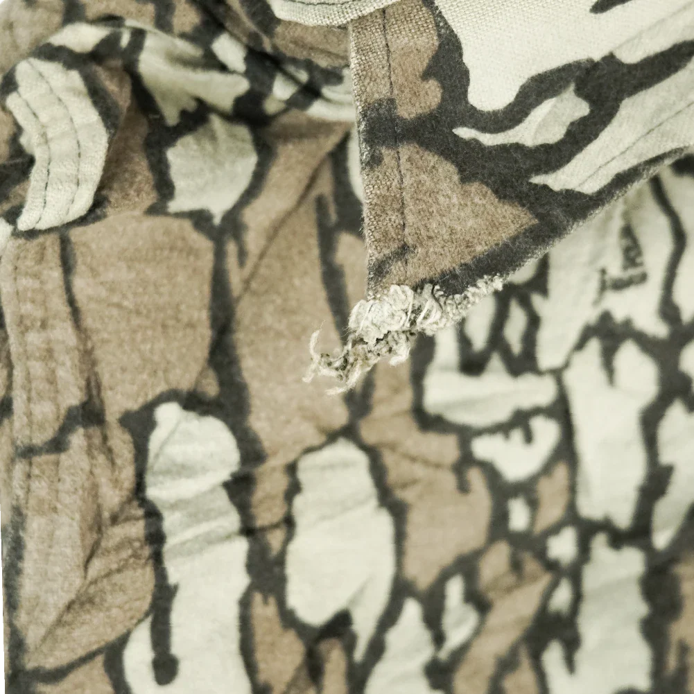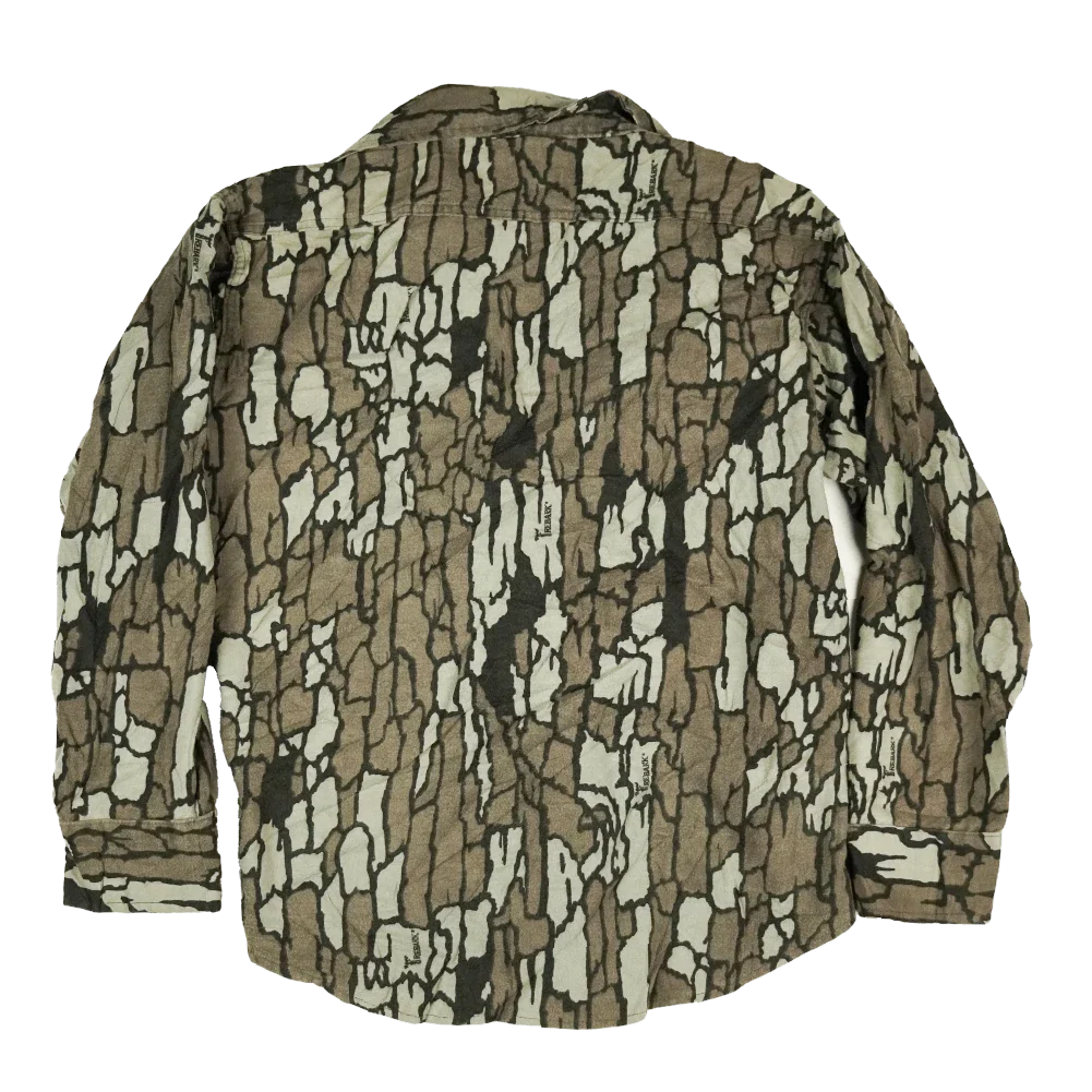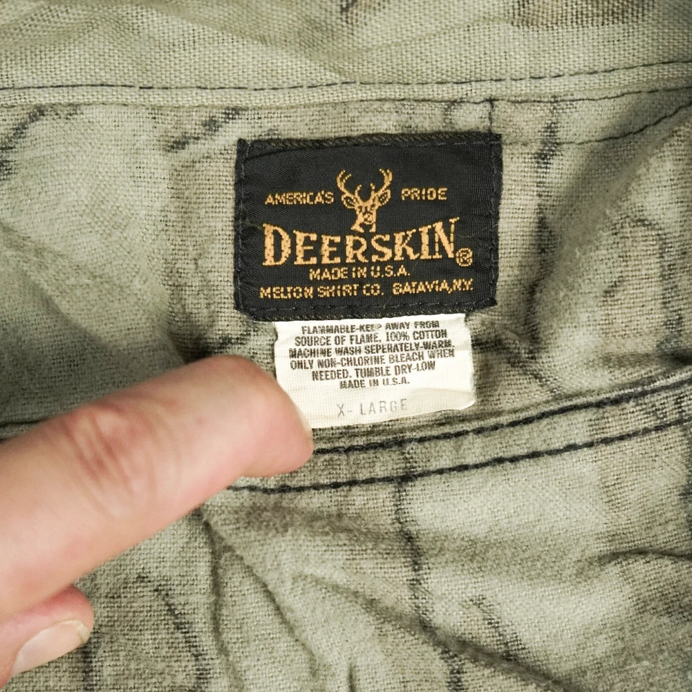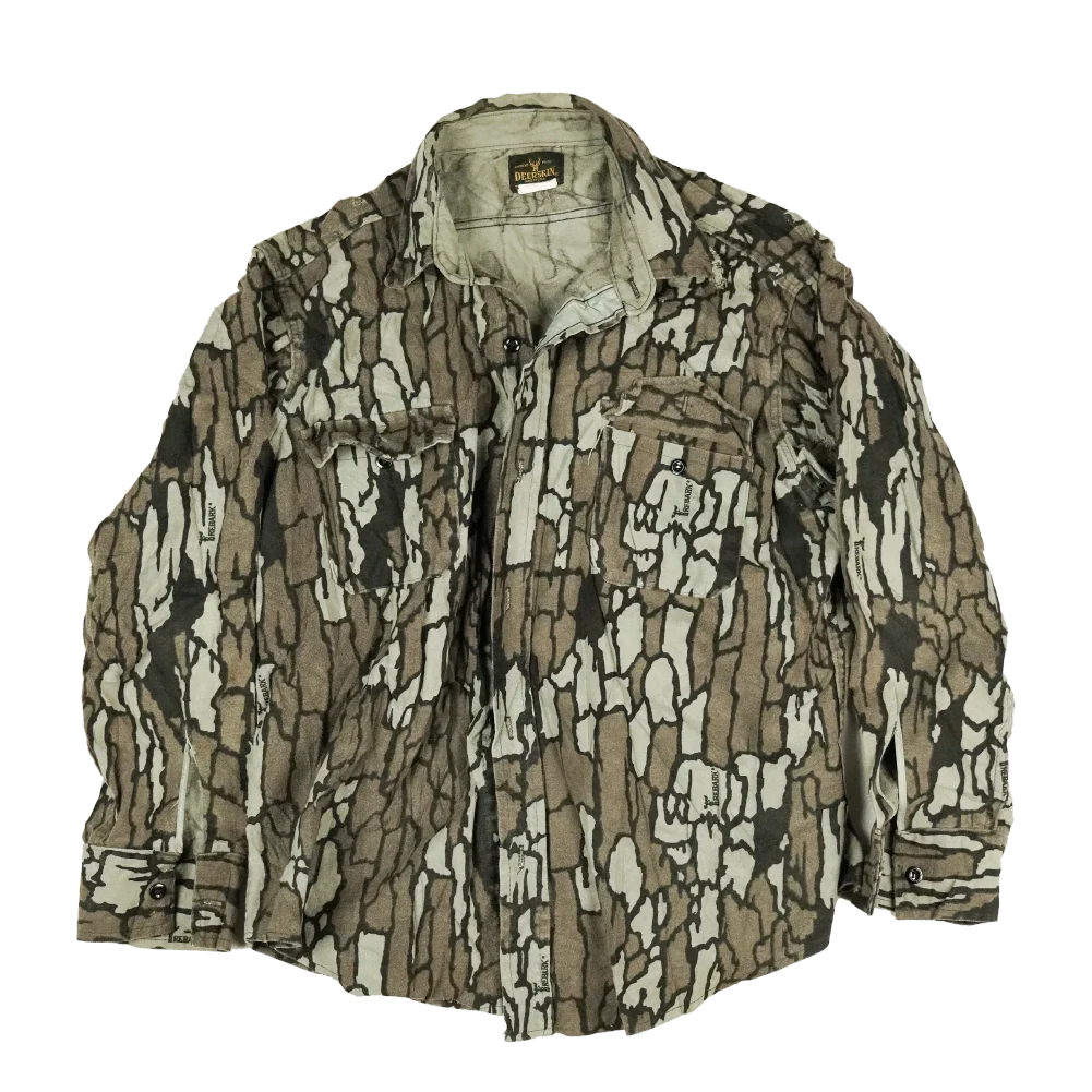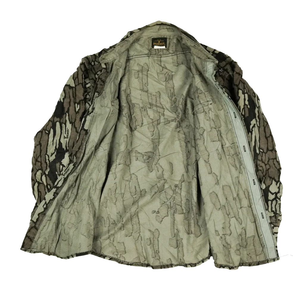 Vintage Deerskin commercial hunting shirt made in the USA. Features a Trebark-style woodland camouflage pattern and a durable cotton construction. Cut in a practical workwear style with chest pockets.