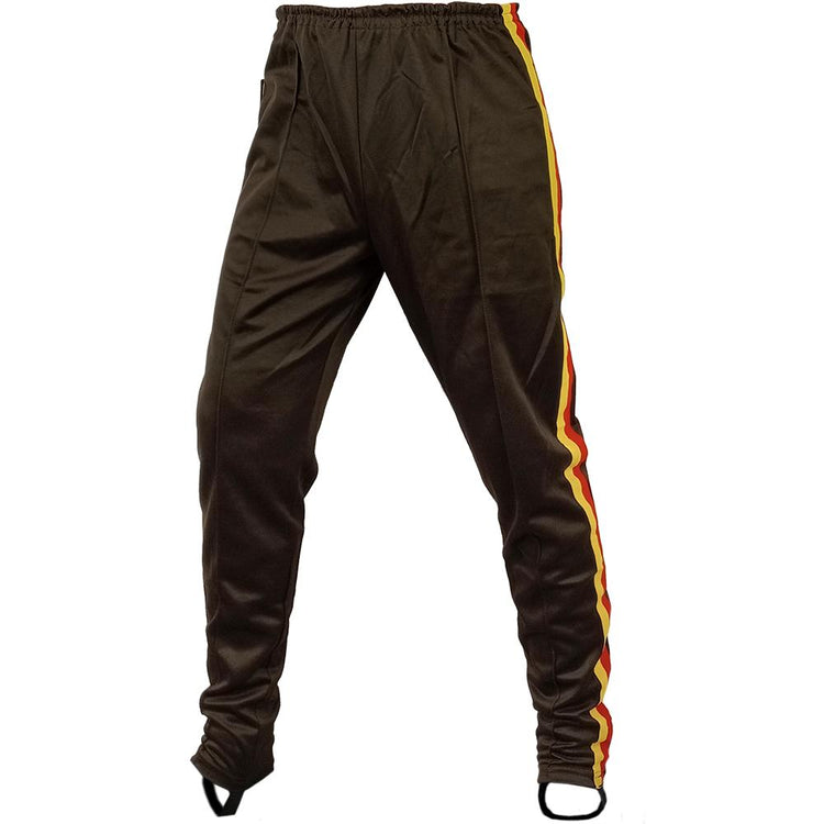These gym pants have a interesting fit - an elasticated waistband as you would expect, however the legs taper inwards and have zippers to splay the ankles to fit your feet through. To help keep the pants from riding up during exercise, the legs have loops to wear underfoot. A single rear zippered pocket allows for storage of your keys and maybe a small cellphone or wallet. And of course to top it off, that ever Germanic red & yellow strip down the sides!