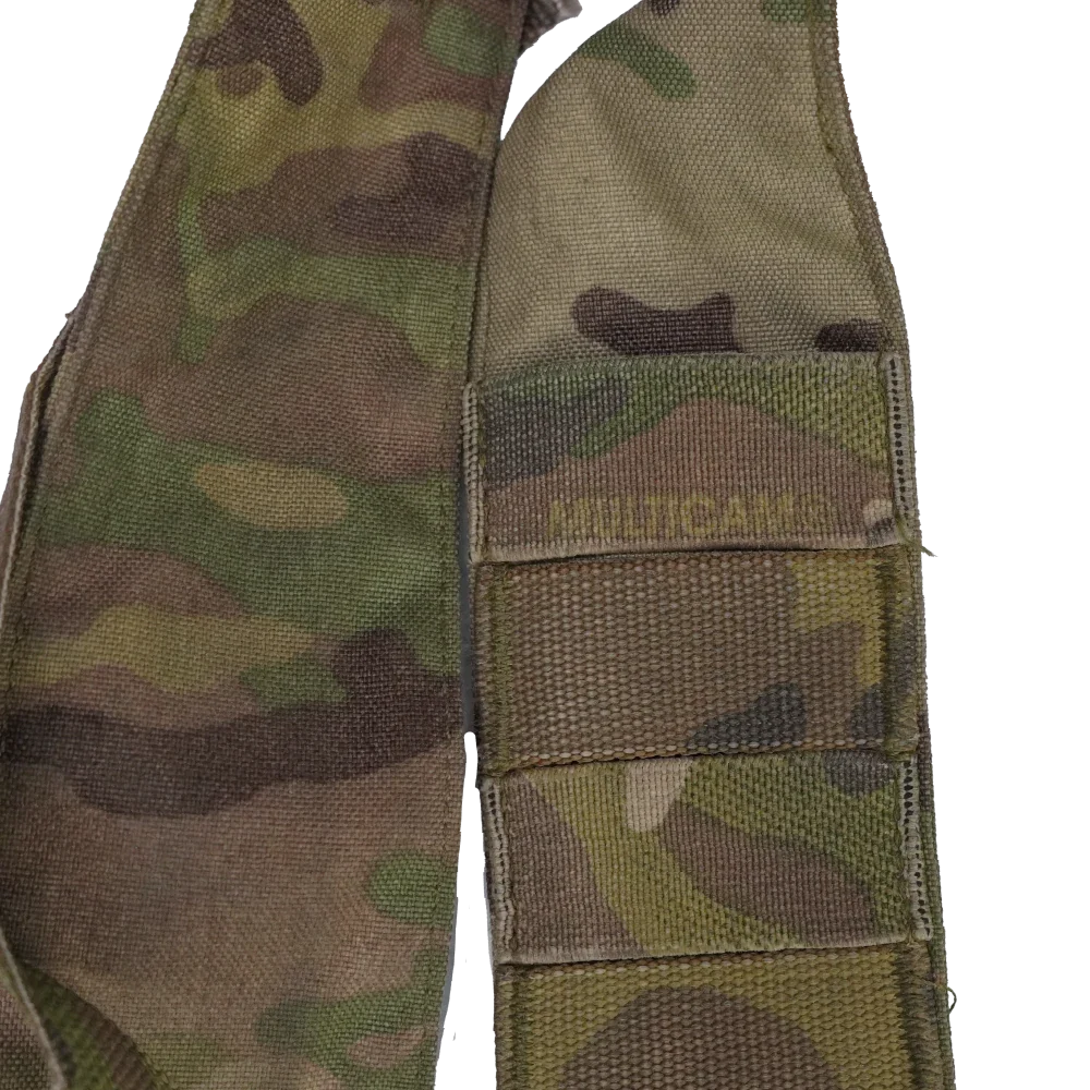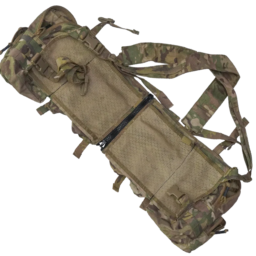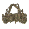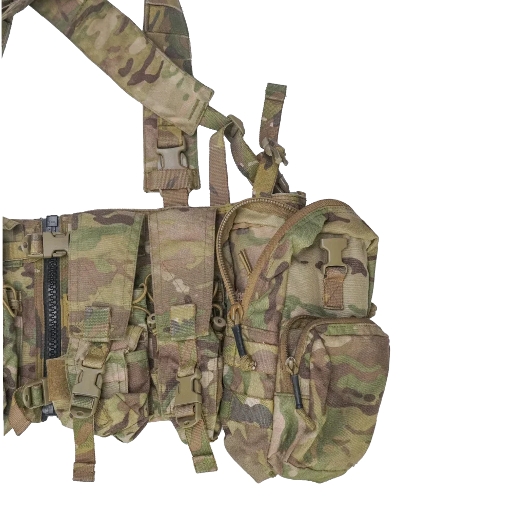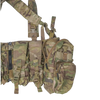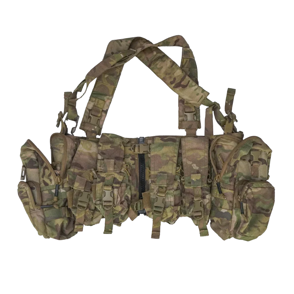Ex-NZDF Platatac CAF MOD chest rig in Multicam pattern. Features a fixed panel layout with multiple integrated pouches across the front, including flap-closure magazine-style pouches, zippered utility compartments, and side-mounted storage pouches. Constructed from heavy-duty fabric with reinforced stitching and webbing attachment points throughout.