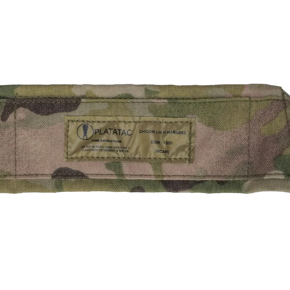Includes both an H-harness and Chicom harness system. The harness features padded shoulder straps, breathable mesh backing, and adjustable webbing with quick-release buckles. Labelled Platatac Chicom LW H Harness with DOM 12/21.