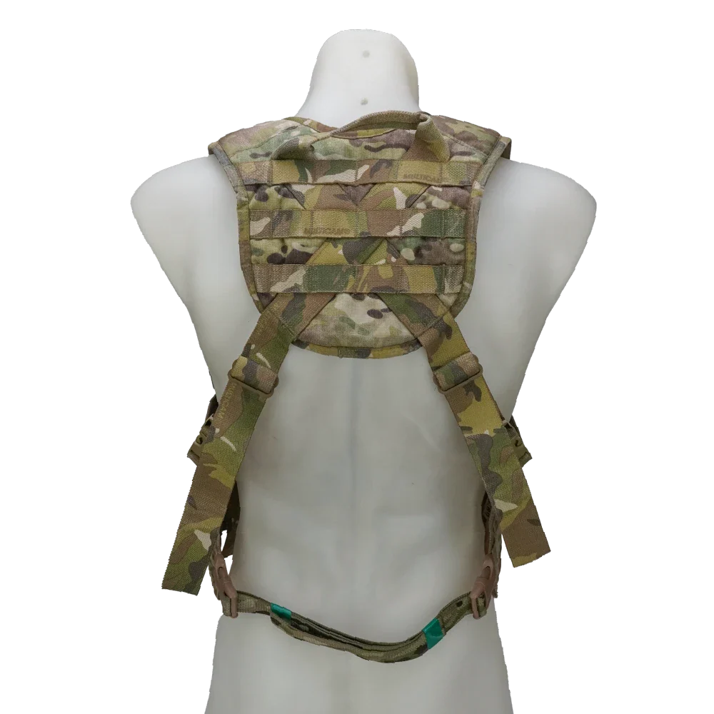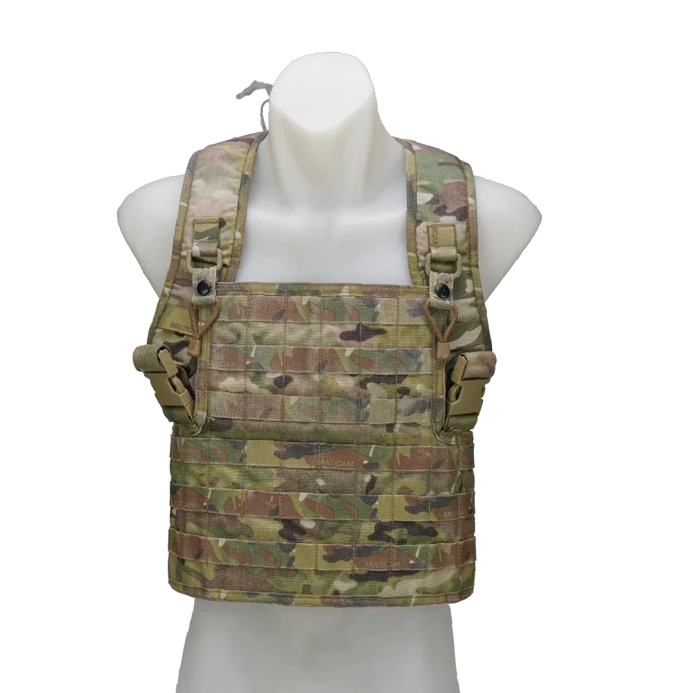Ex-NZDF SORD MOLLE chest rig in Multicam pattern. This is a modular load-carrying rig with MOLLE webbing across the body for attaching compatible pouches and accessories.