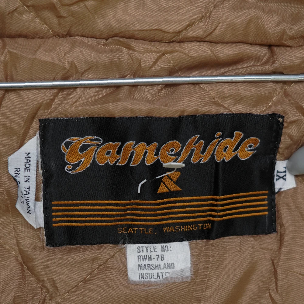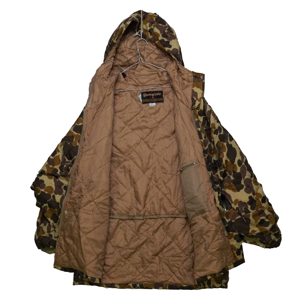 Gamehide Duck Hunter Camo lined jacket with hood in XLarge. Features a camouflage outer and full lining for added warmth, with an attached hood.