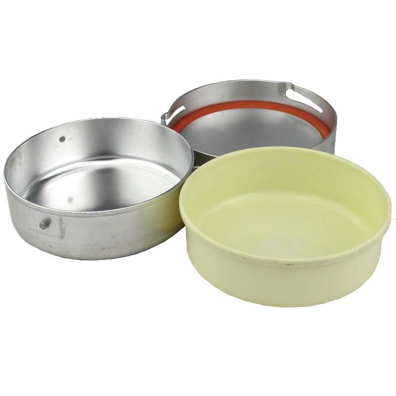 Made of Aluminium these are robust and hard to dent. The lid twists on tightly and has a rubber seal to keep it air tight and the contents fresh. The bottom half of the tin has a plastic bowl you can remove if you wished to store something else such as tobacco. The dish lid has a Bundesadler eagle imprint and on the bottom on the tin it has the NSN number.