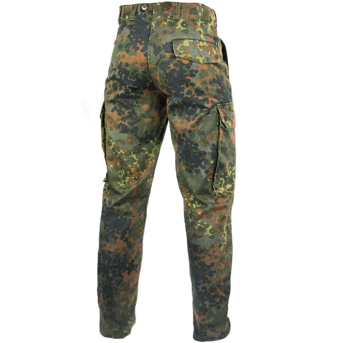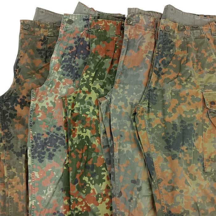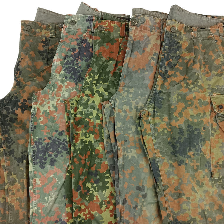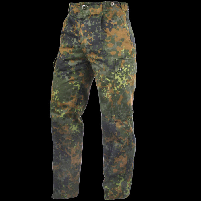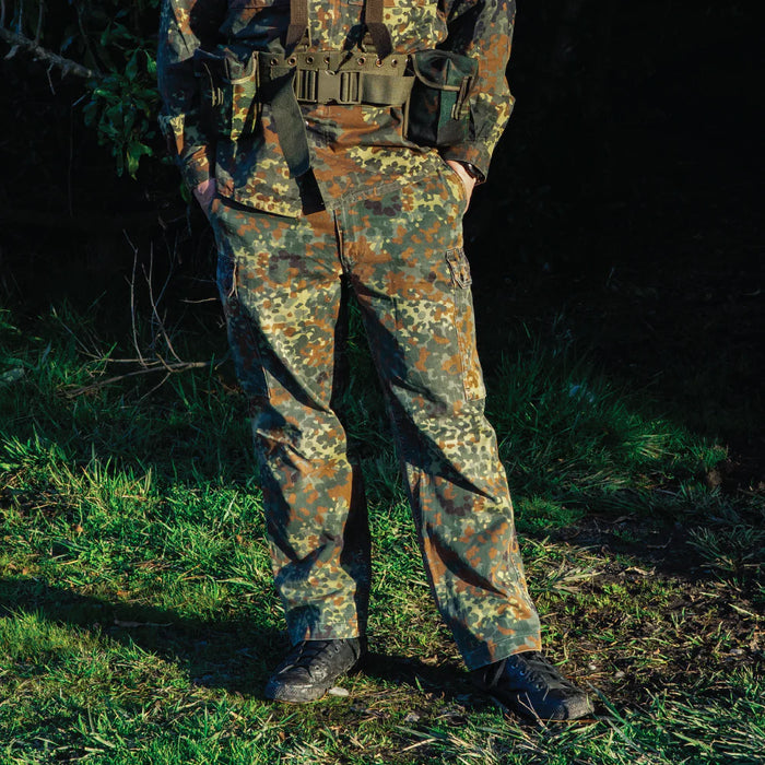 Here we have some genuine German army Funf Farben Tarndruck der Bundeswehr (Five color camouflage of the Bundeswehr) or simply Flecktarn camouflage Trousers. Made from a blend of cotton/polyester, these trousers are comfortable and hard-wearing.