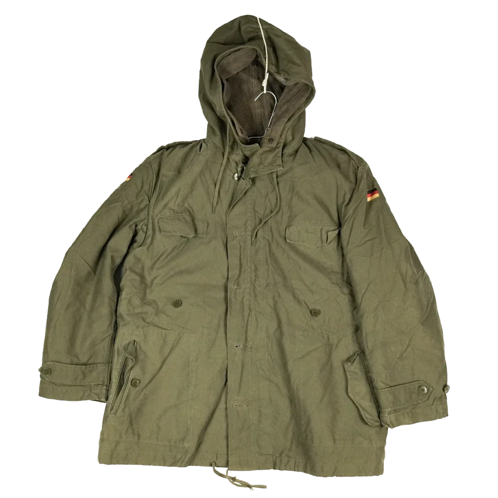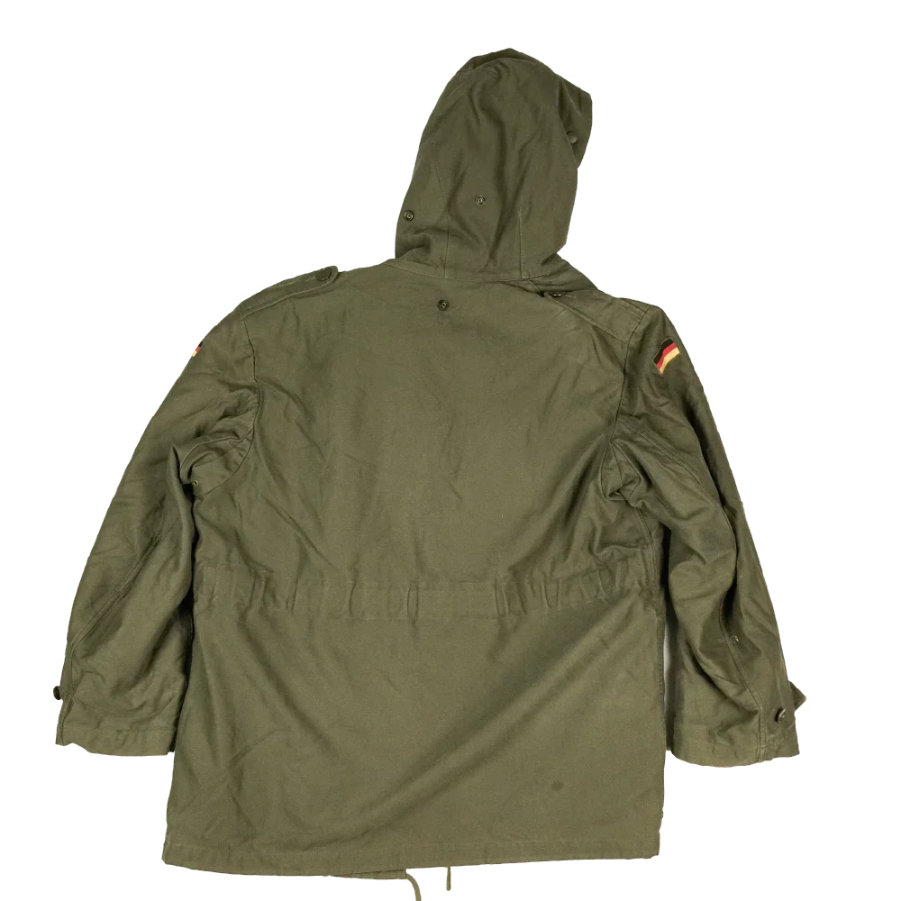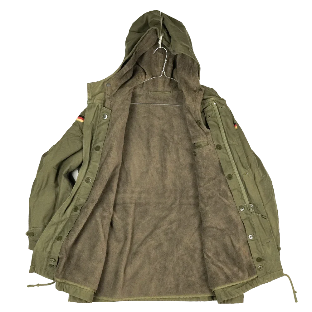 German military surplus parka in a classic olive drab finish. This is a full-length cold-weather jacket with a removable insulated liner and multiple storage pockets.