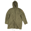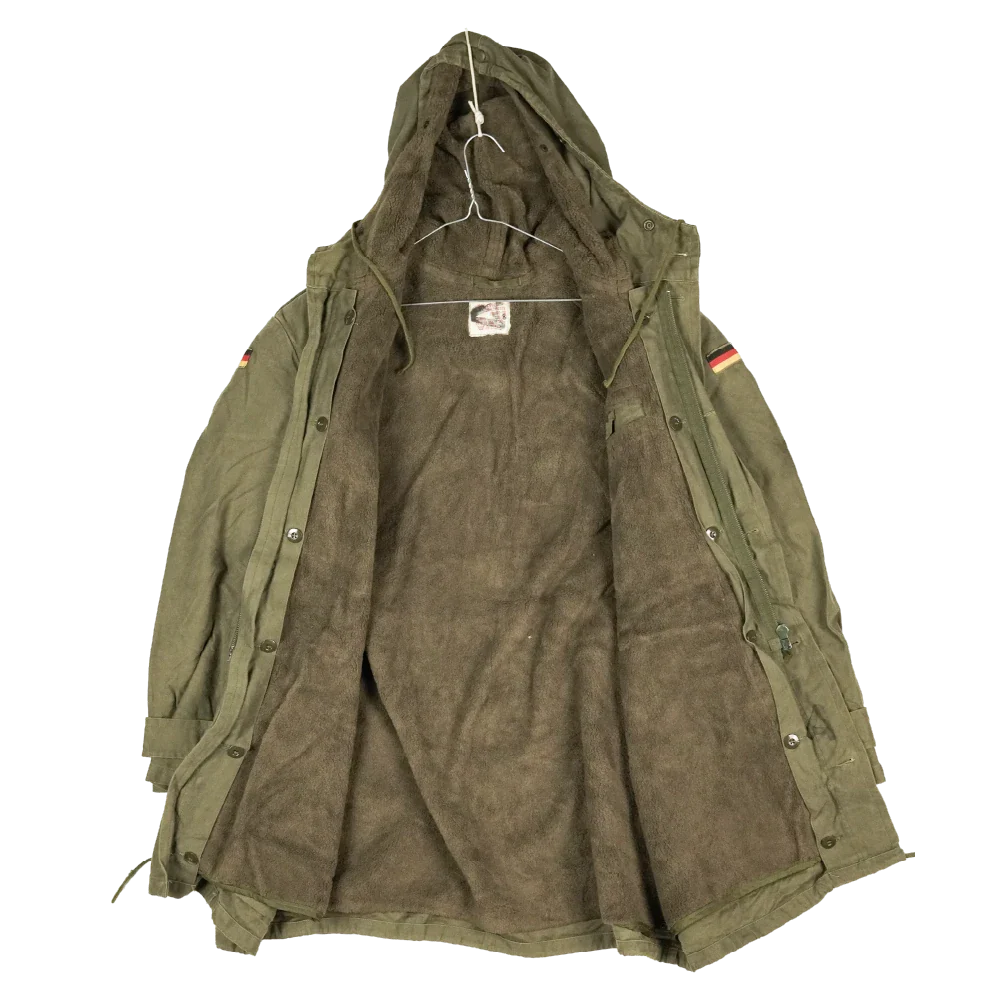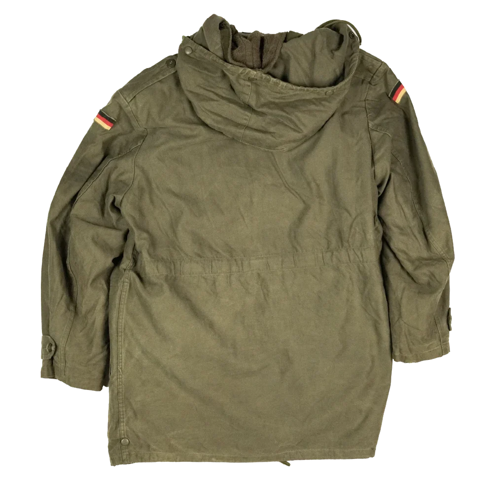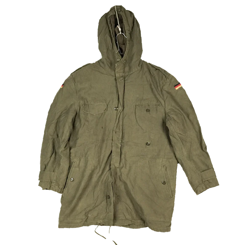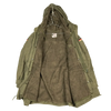 German military surplus parka in an olive drab finish, size Gr8 (Large Regular). This is a full-length parka with a removable insulated liner and multiple external pockets.