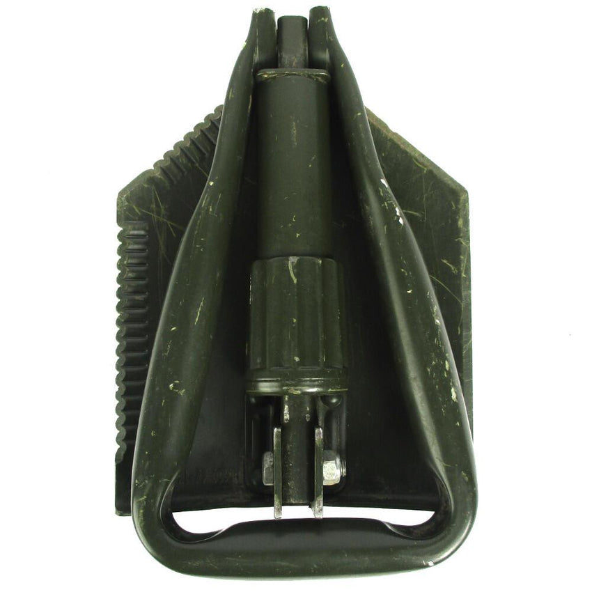 These collapsible shovels are stamped with "BUND", meaning Bundeswehr - the German Armed Forces. Built to NATO specifications, this steel shovel is able to be configured in to three different forms. Fully extended, this shovel is ideal for standard digging use. The shovel head can be locked in a 90 degree position, making a mattock-like shape. This is good for vertical digging. The final configuration fully collapses the shovel for it to fit in the flecktarn carry case.
