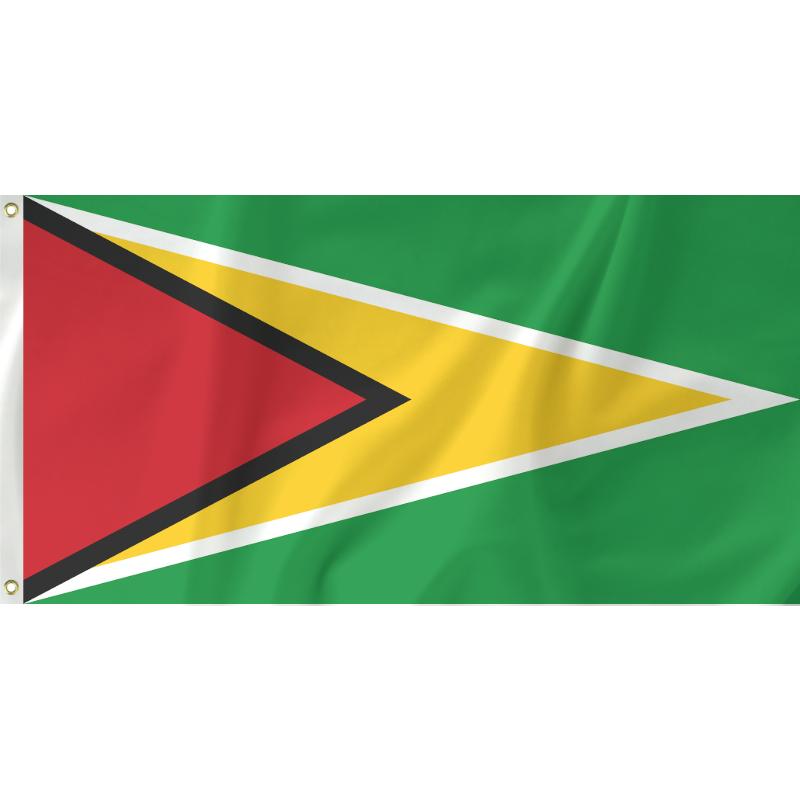 Guyana adopted their current national flag in 1966 when they gained independence from the United Kingdom. The red triangle stands for zeal and dynamism, gold for mineral wealth, black for endurance, white for rivers and water and green for agriculture.
