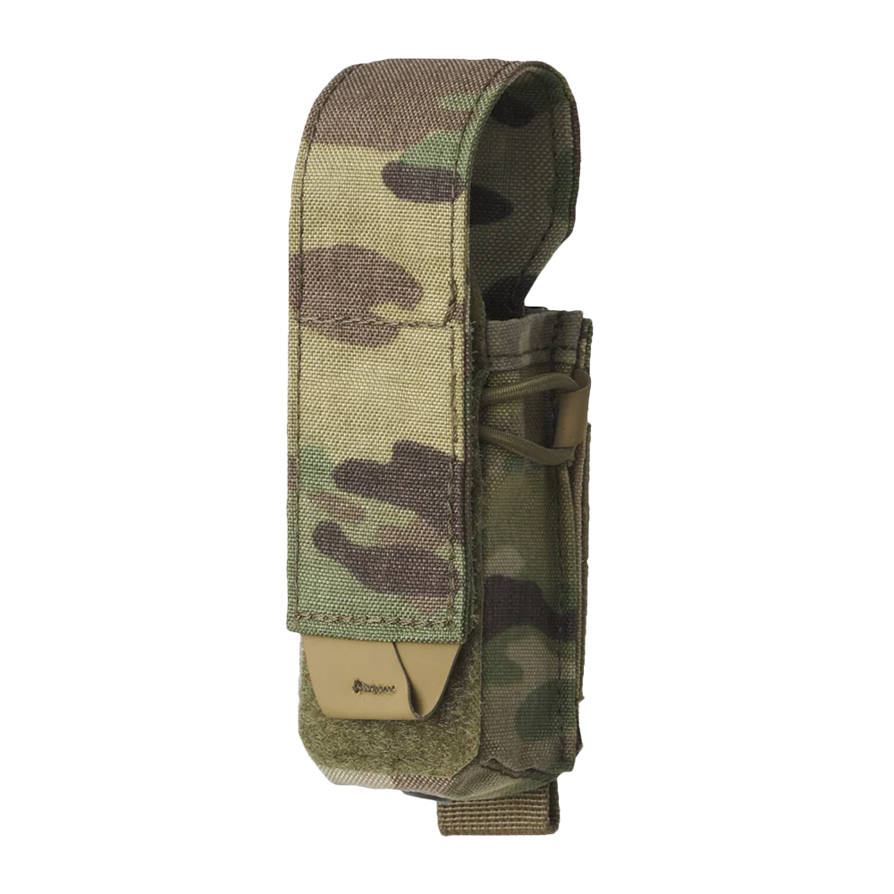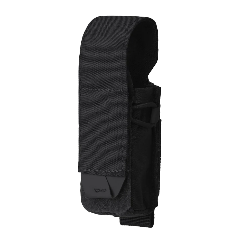 The Pistol Magazine Pouch is designed to hold a pistol magazine or similar-sized items. The pouch closes with a hook & loop flap and a non-slip grip for easy opening. The detachable flap and elastic drawstring allow for versatile use in an open configuration. A reinforced front panel facilitates easy insertion and removal of the magazine. The pouch attaches using a MOLLE/PALS compatible modular system.