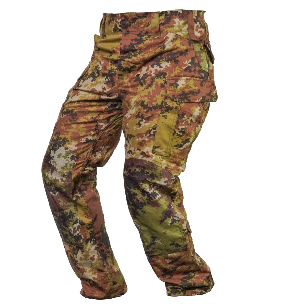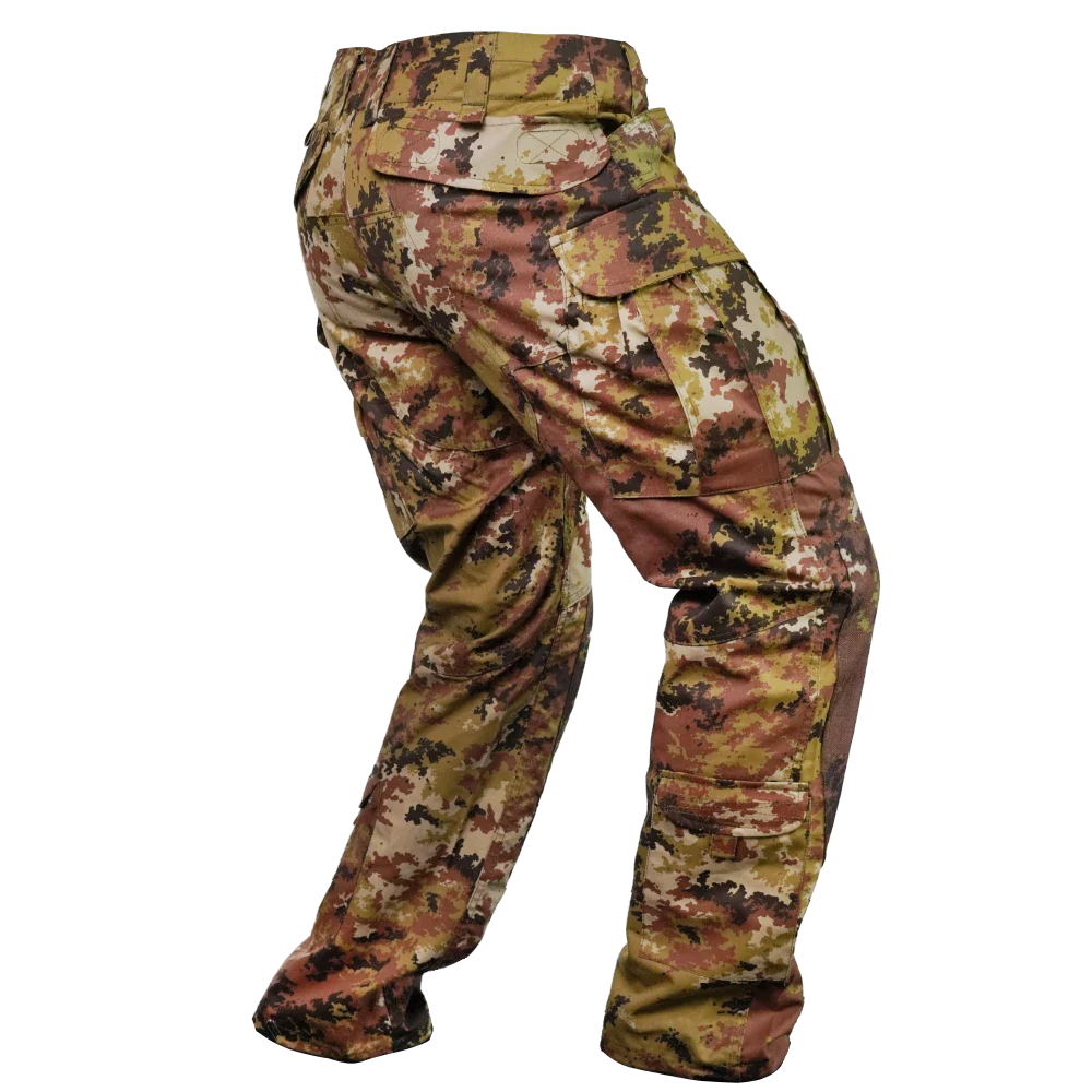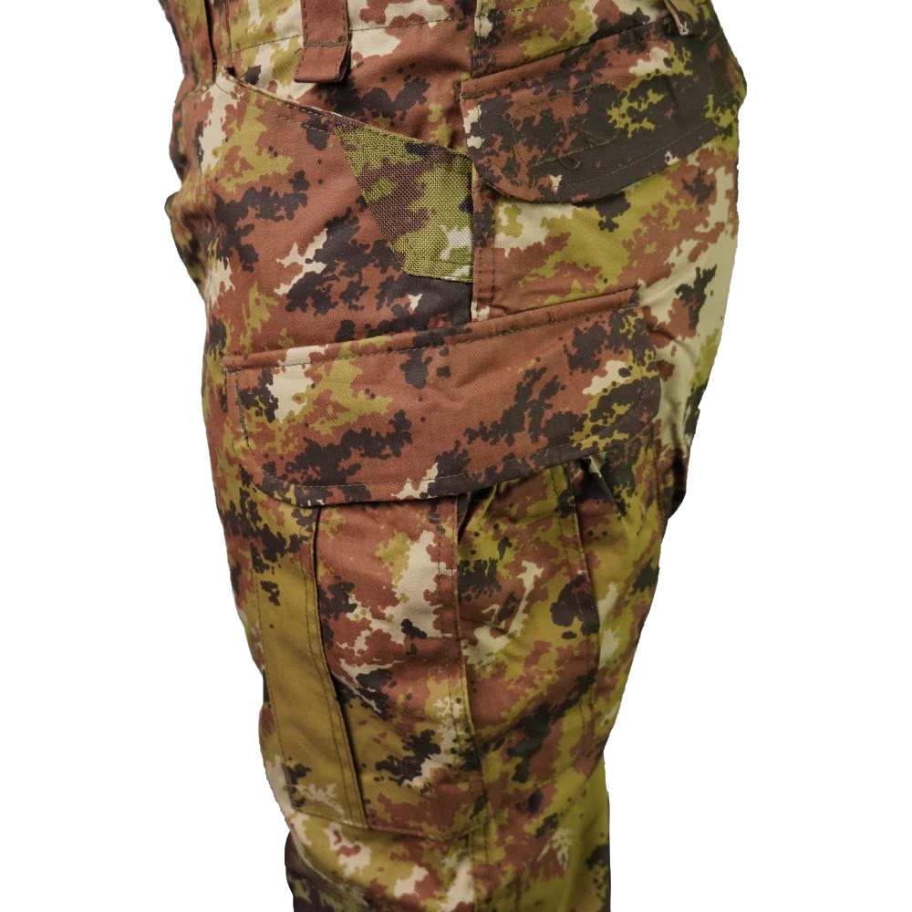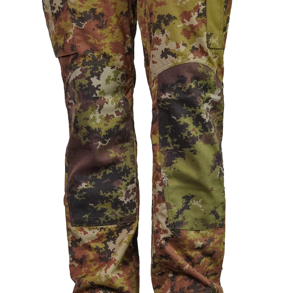 Italian Army Vegetato camouflage field trousers with integrated knee pads. Constructed from uniform-grade fabric in a 96% cotton and 8% polyamide blend, with a functional field cut, belt loops, reinforced stitching, and cargo-style leg pockets.