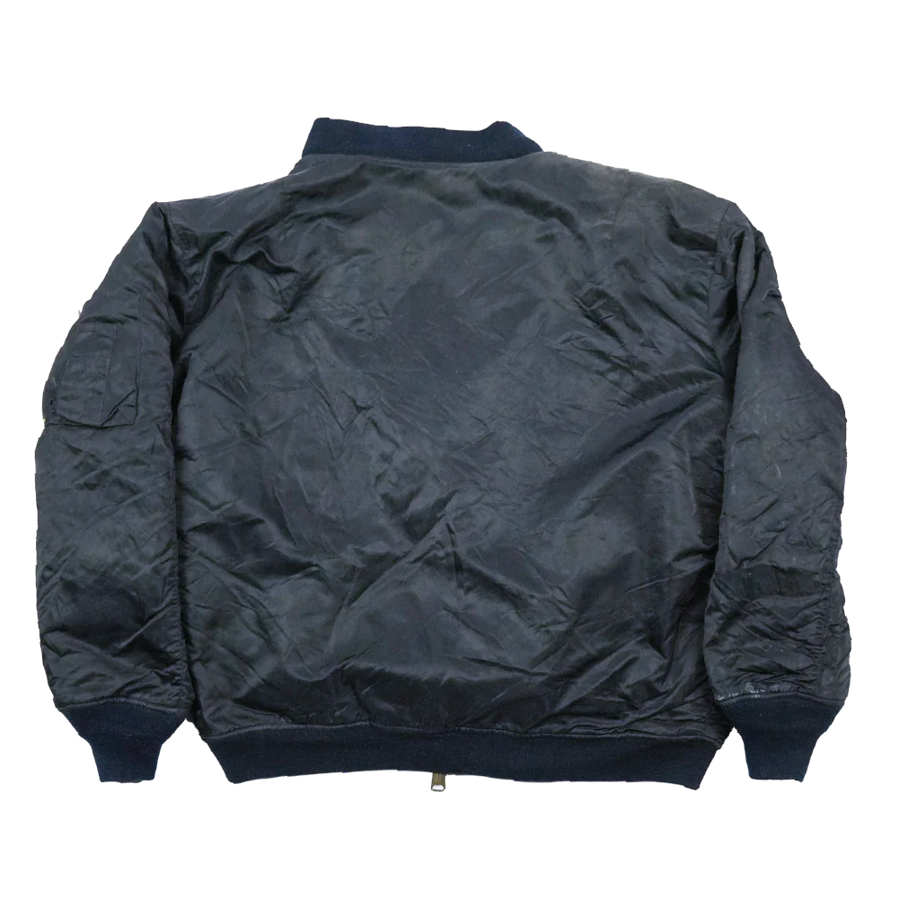 Commercial MA-1 style flight jacket in black. Nylon and polyester construction with elasticated collar, cuffs, and waist. Features multiple pockets including interior storage with dome fastening.