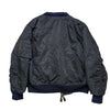 Two angled front flap pockets with press-stud closures and a zippered utility pocket on the left sleeve. Labelled “Jacket, Flyer’s Man Intermediate, MA-1” with nylon shell and lining.