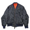 Commercial MA-1 black flight jacket in used/very good condition. Black nylon outer shell with bright orange lining and polyester fibre fill insulation. Features a full front metal zip closure and rib-knit collar, cuffs, and waistband.