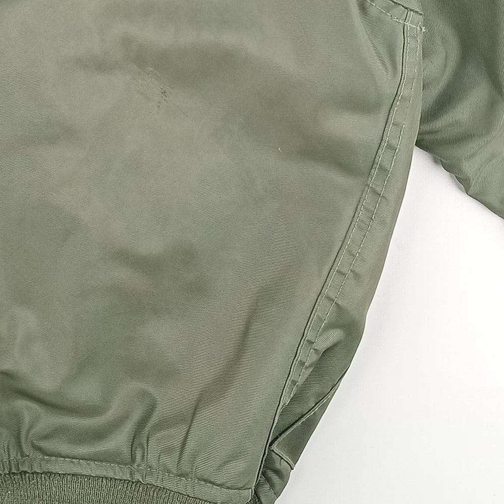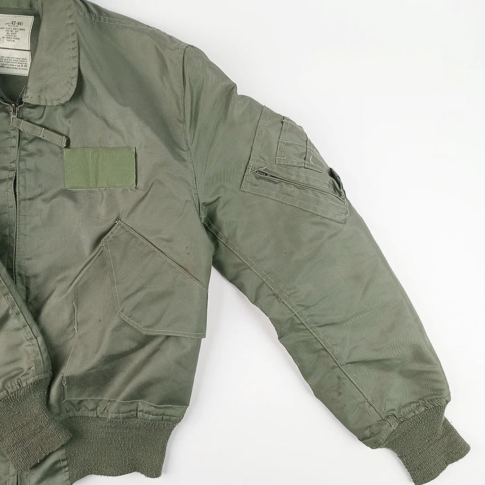 The USAF CWU-36/P Men’s Summer Flyers Jacket is a lightweight, fire-resistant flight jacket introduced in the 1970s to replace the MA-1 for warmer climates. Constructed from aromatic polyamide fabric, it provides protection against heat and flame while offering comfort during flight operations. Featuring a zip front, angled chest pockets and knit cuffs, it became standard issue for U.S. Air Force and Navy pilots. Its functional design and military heritage make it a sought-after piece for collectors and aviation enthusiasts. This jacket from 1993 is in good condition with light scuffs and stains to the outer fabric, particularly on the lower front. The elastic cuffing has pilling and 2 small holes to the right wrist cuff.