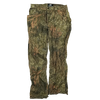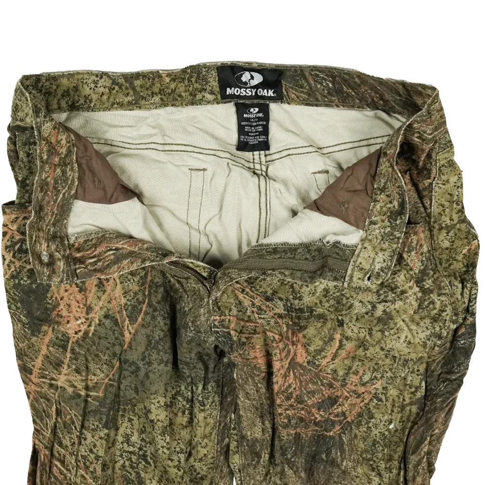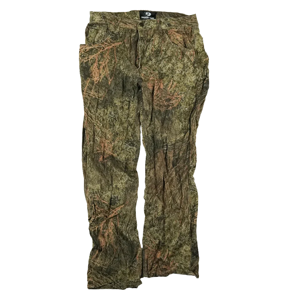 Commercial Mossy Oak hunting pants in a printed camouflage pattern. Full-length trousers with a standard cut.