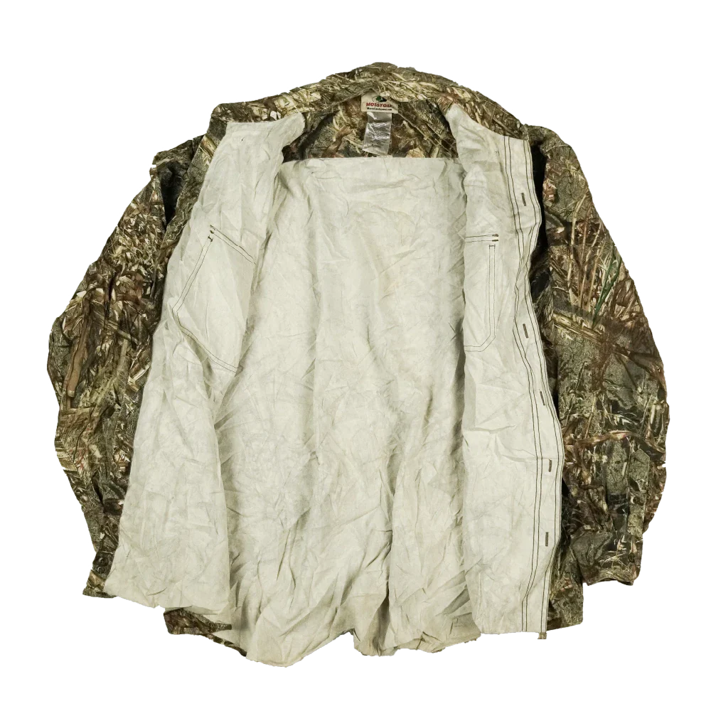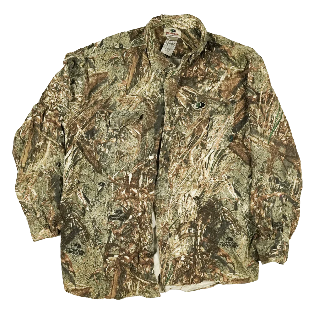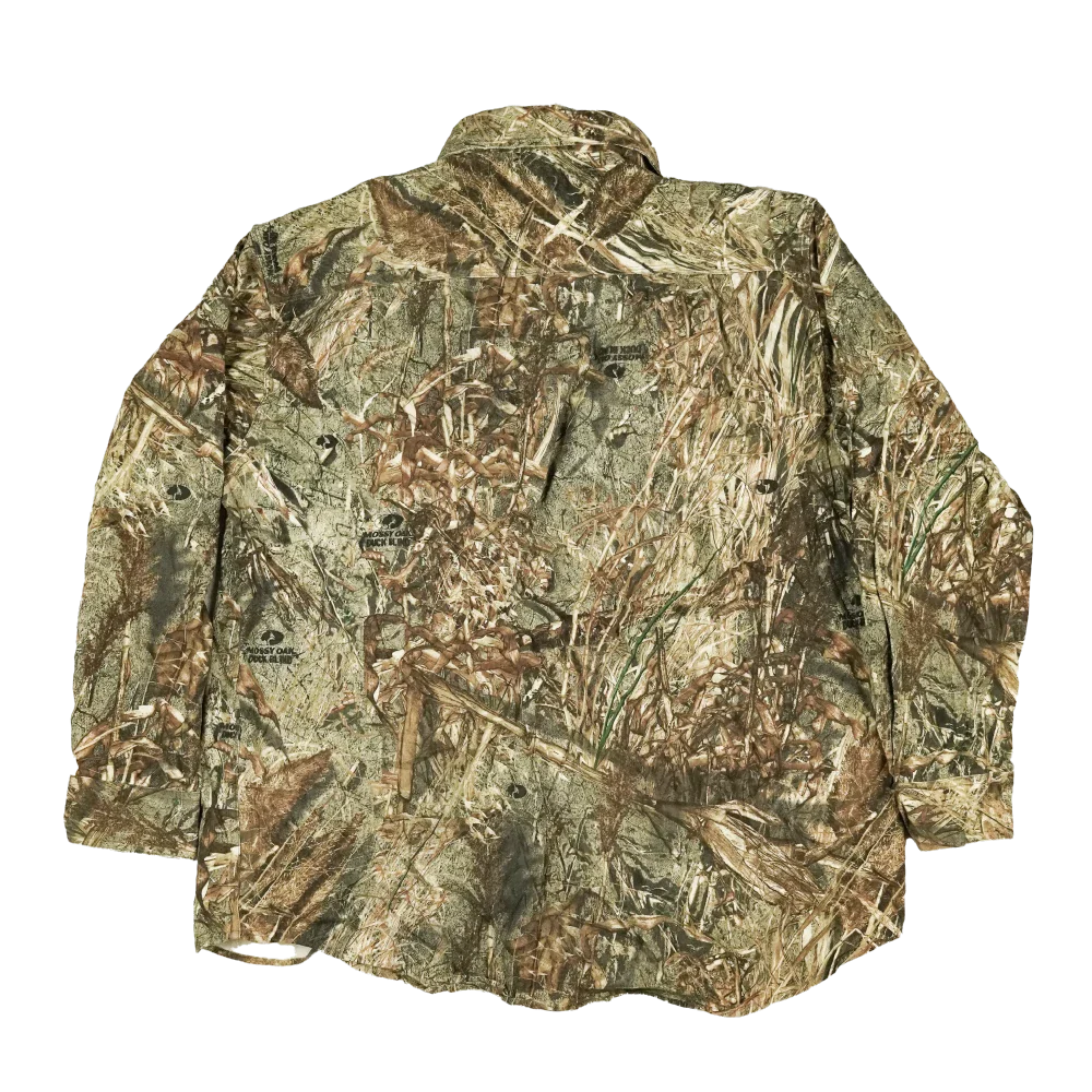 Commercial Mossy Oak long-sleeve button-up hunting shirt finished in a photorealistic marsh and grass camouflage. Lightweight civilian shirt with a classic button-front construction and chest pockets.