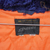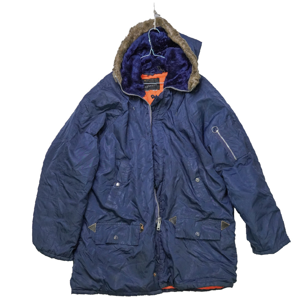 Navy blue military style parka in a commercial pattern. Features a full-length front zip and standard parka-length cut.