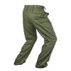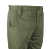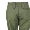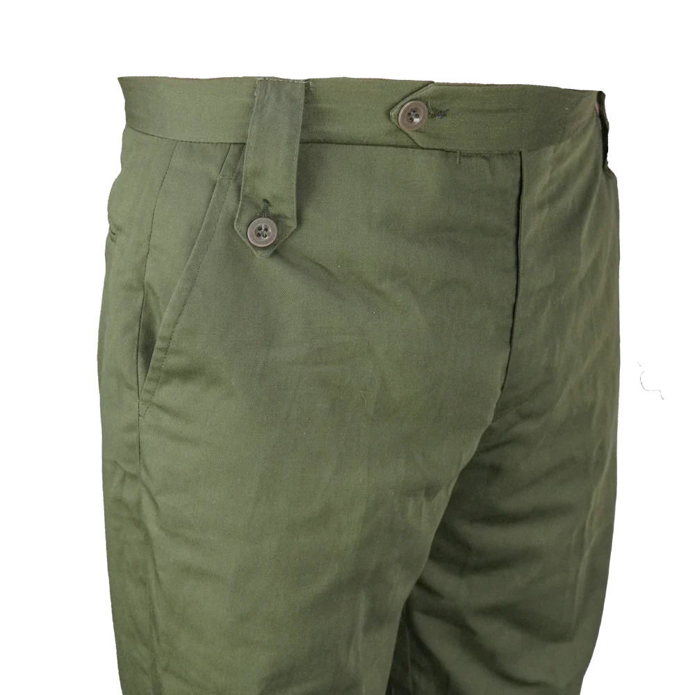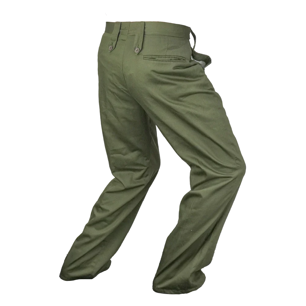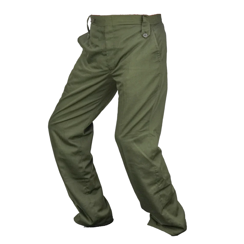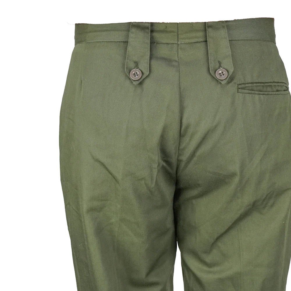 NZ Army service trousers in olive polyester. They have a clean plain-leg dress cut with angled front pockets, a rear welt pocket, and buttoned waist tabs.