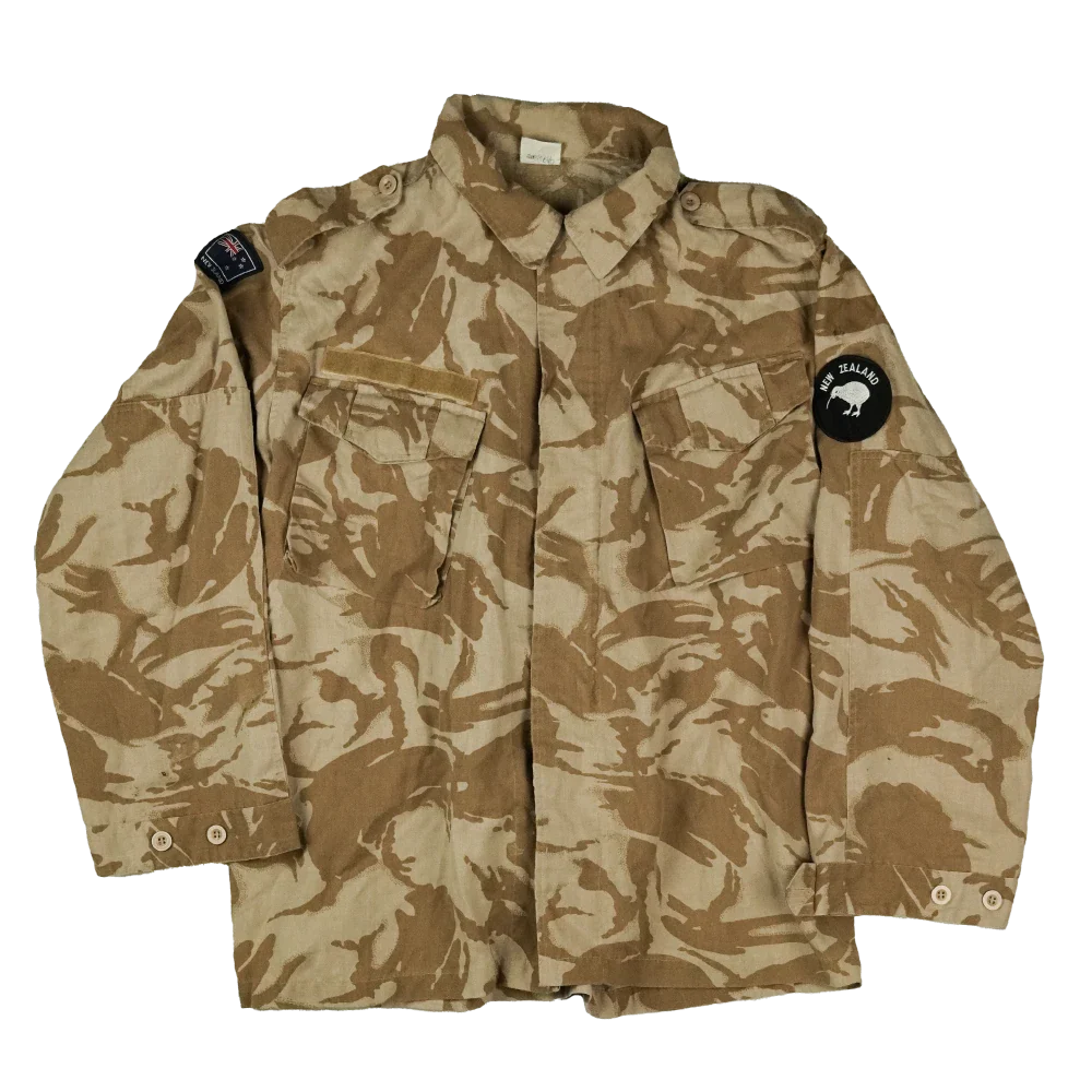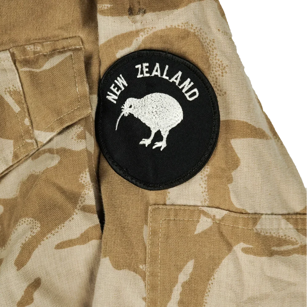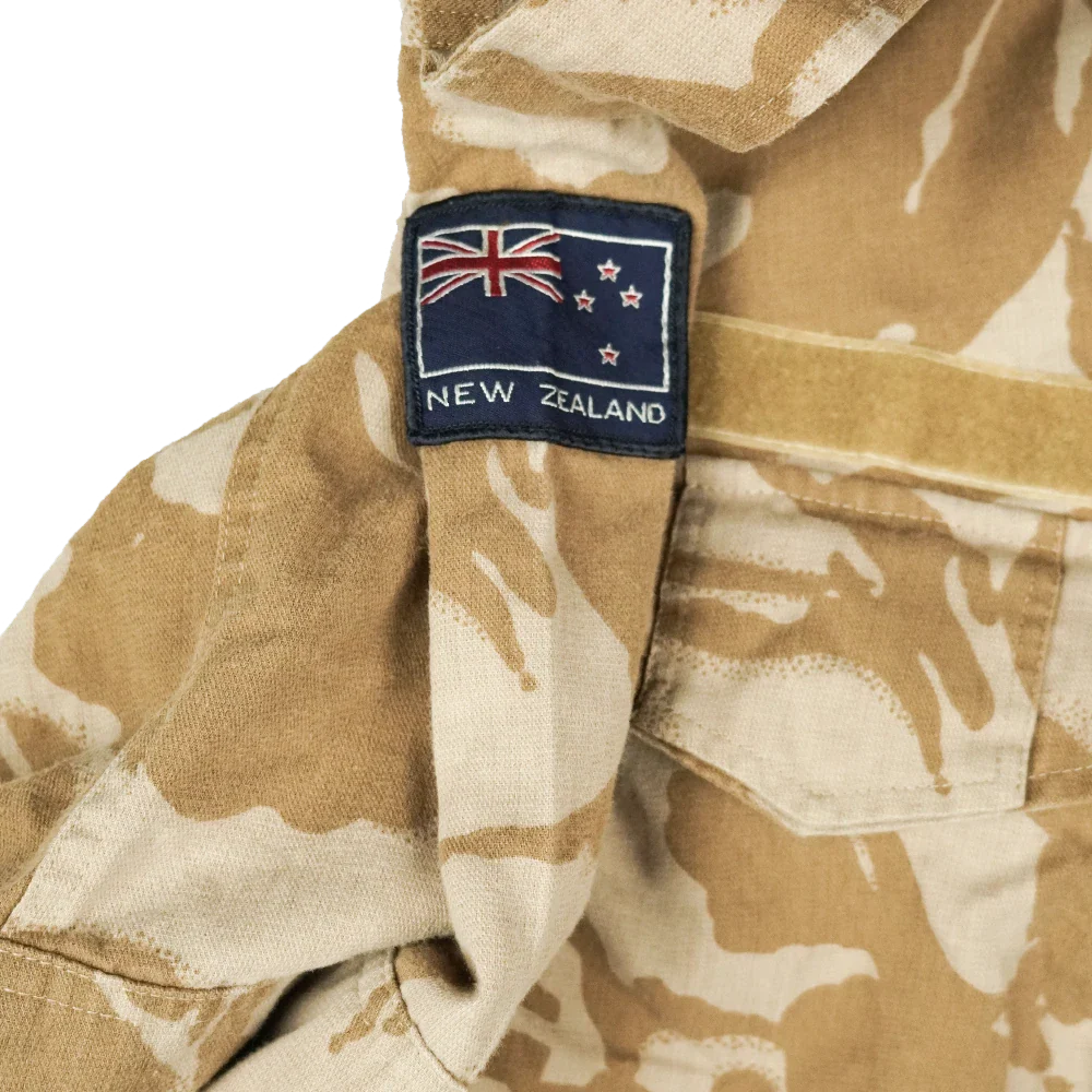 New Zealand Defence Force Desert DPM camouflage shirt. This shirt features sewn-on New Zealand flag and Kiwi patches.