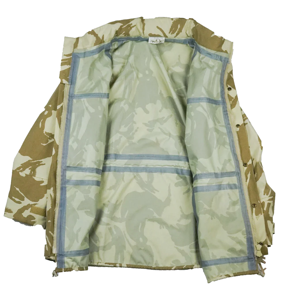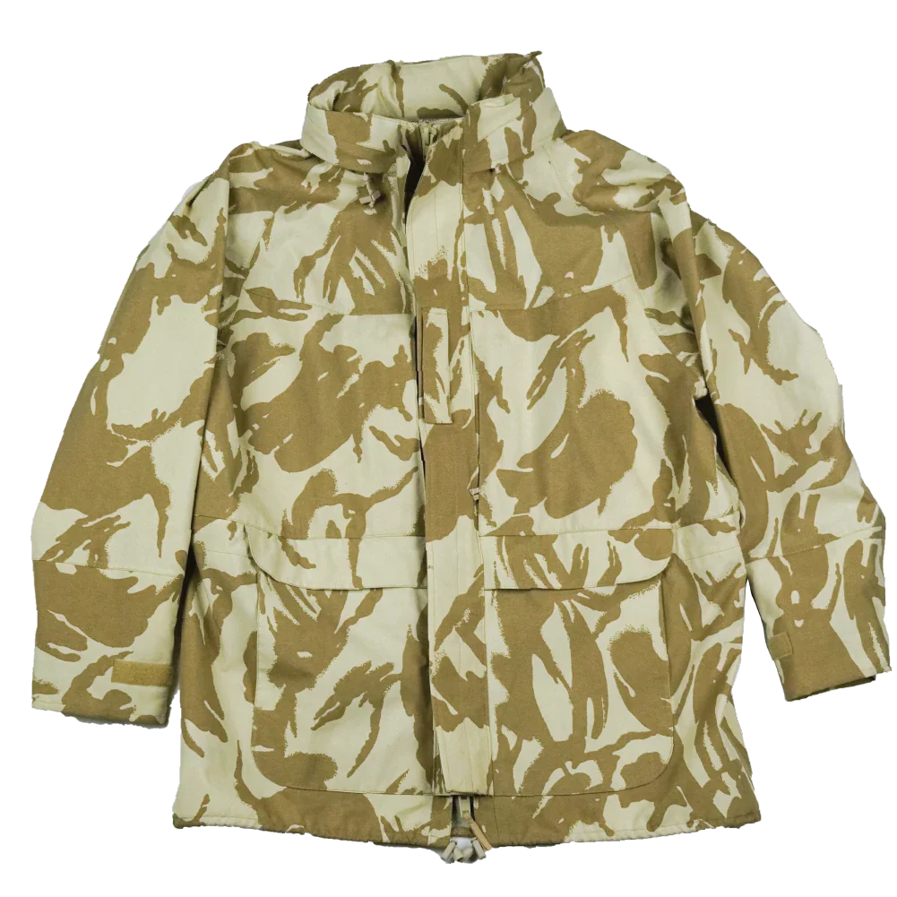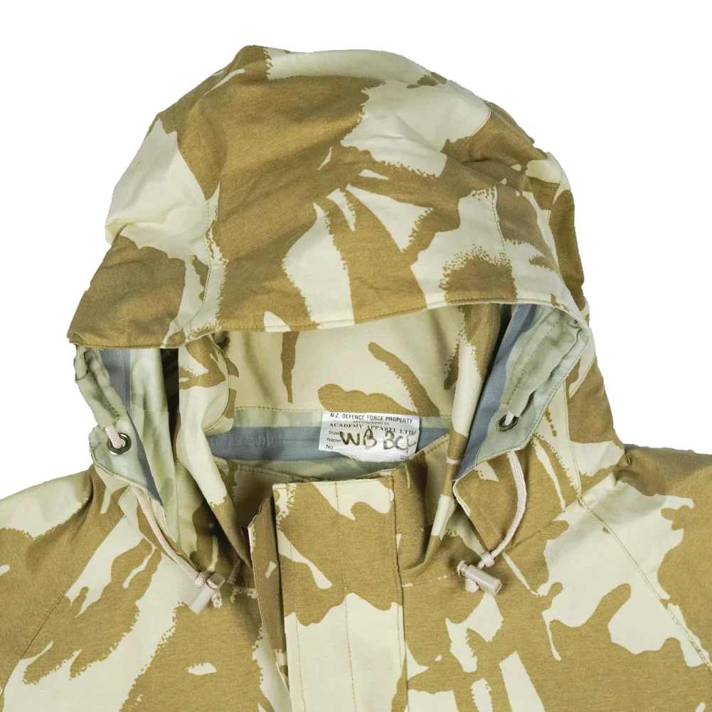 Surplus New Zealand Army waterproof jacket in desert DPM camouflage. This is a full-length outer shell style jacket with a robust, weatherproof construction.