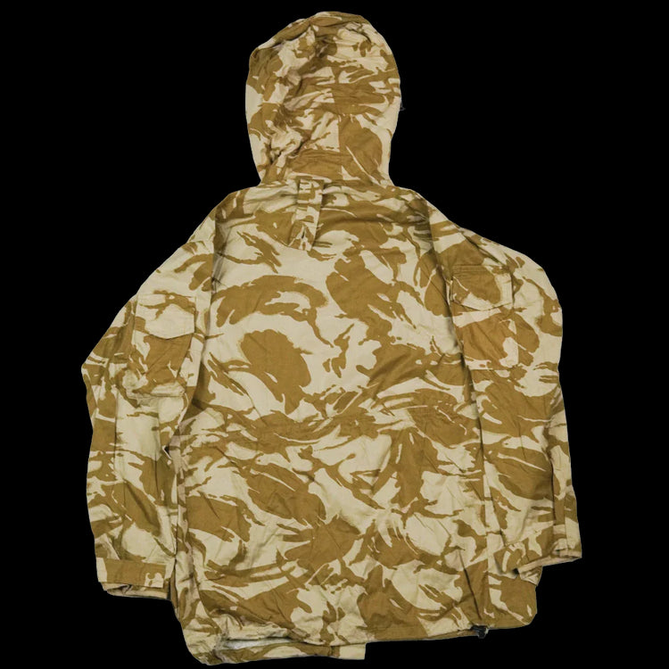 New Zealand Defence Force issue windproof jacket in desert DPM camouflage. Features a zip and press dome front with a high neck collar and wired hood. Multiple chest, sleeve, and hip pockets provide storage, with drawcord adjustment at the waist, hood, and hem.