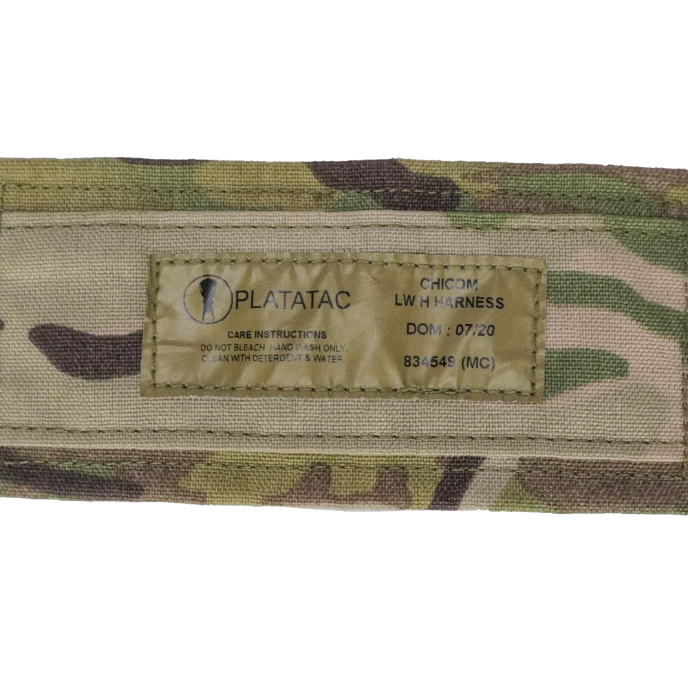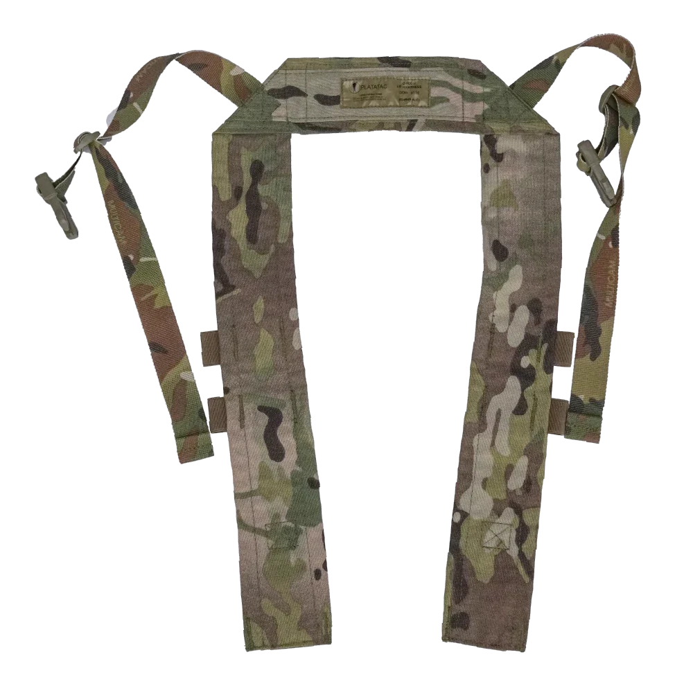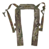 Lightweight H-harness in Multicam pattern, designed for use with compatible chest rigs. Features a wide padded shoulder section with stitched construction, adjustable webbing straps, and side-release buckles for attachment.