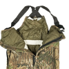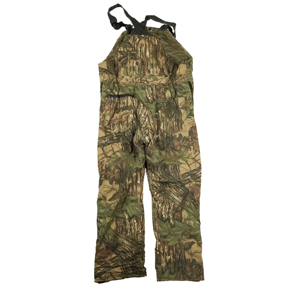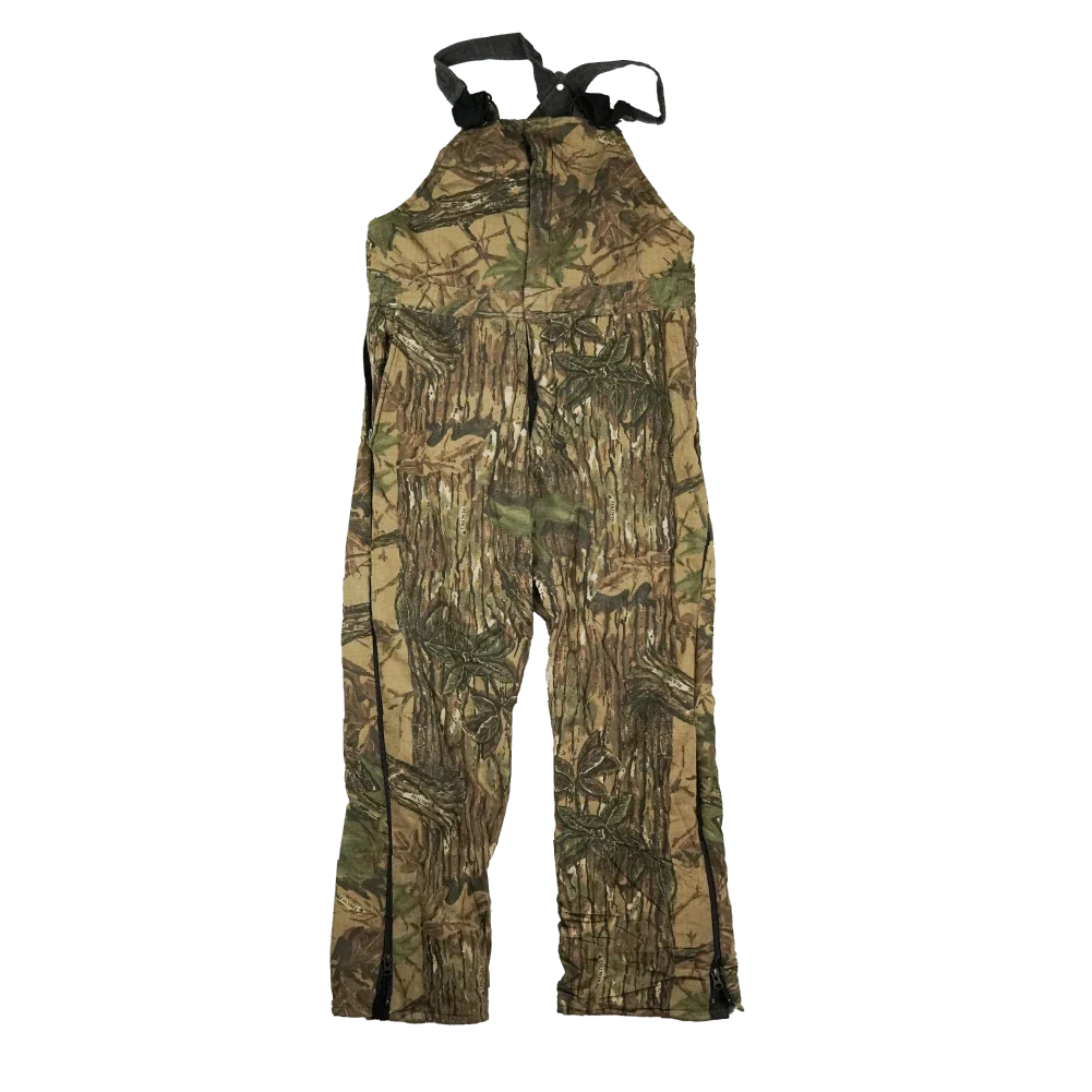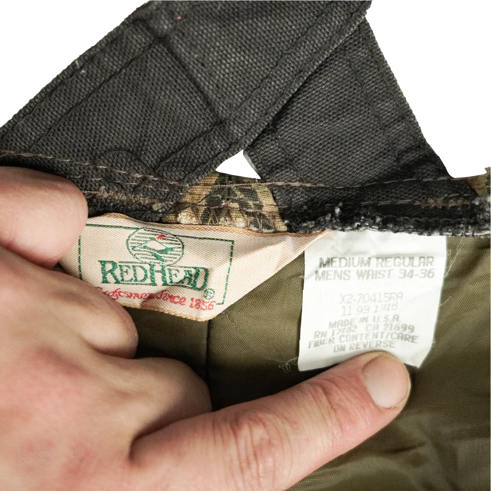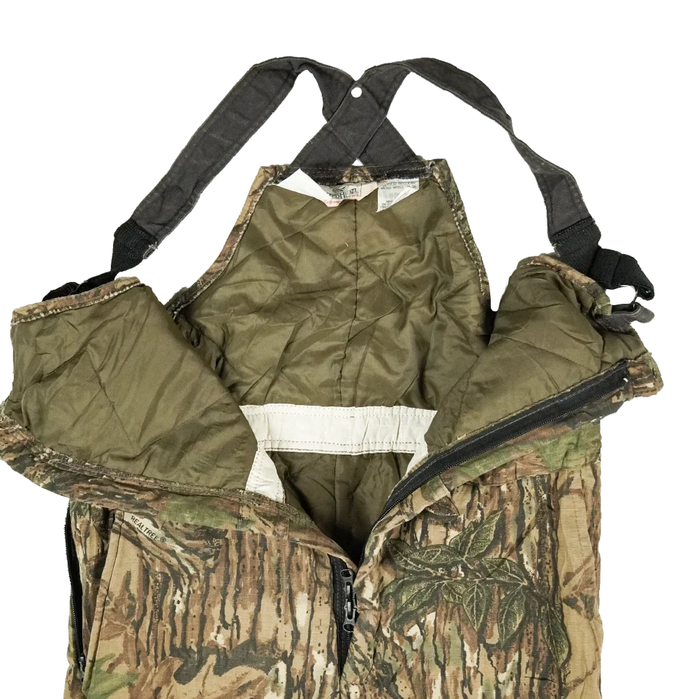 Insulated camouflage overalls by RedHead with a full bib-style coverall cut. Features a zip-front entry and quilted insulation, finished in a Realtree-patterned fabric.
