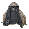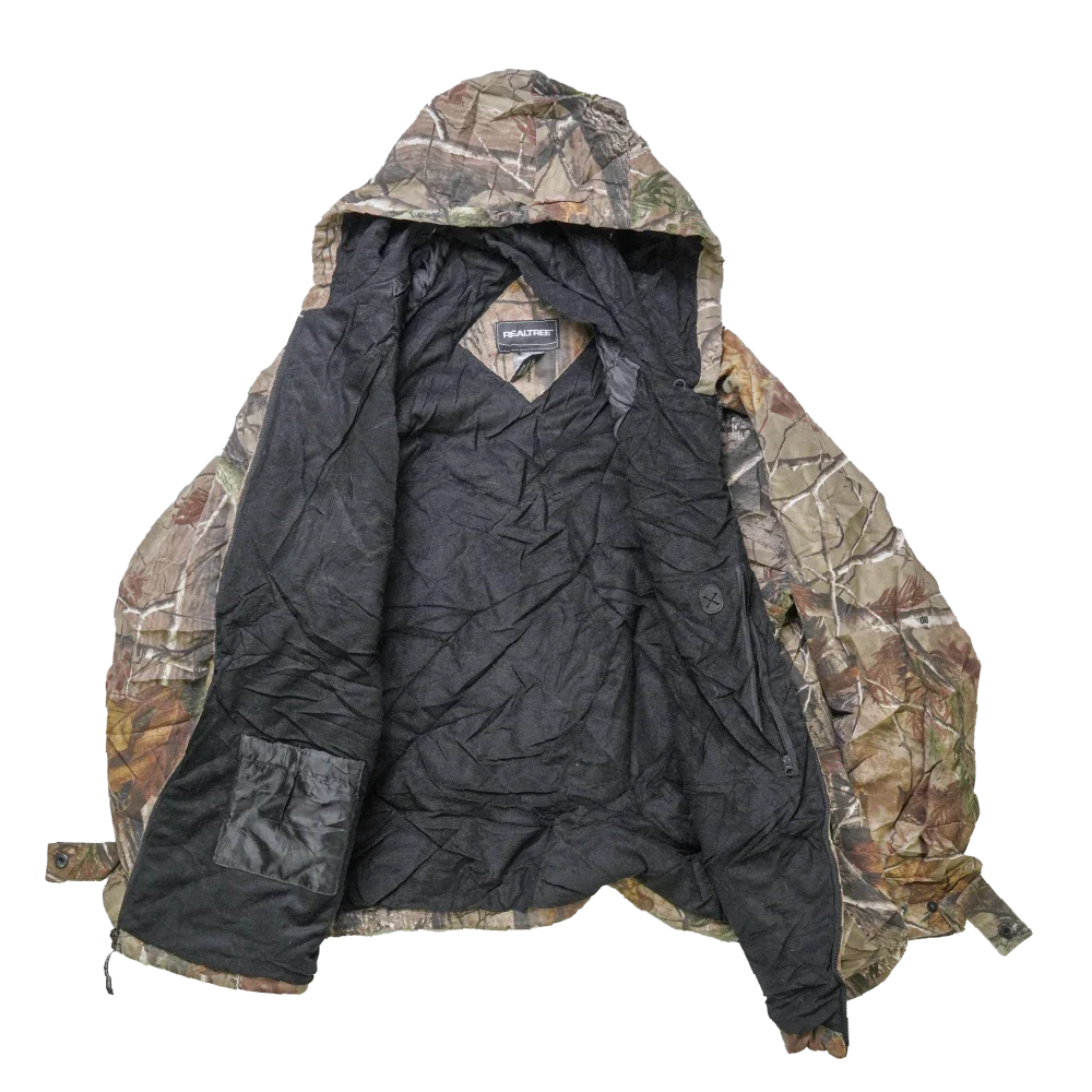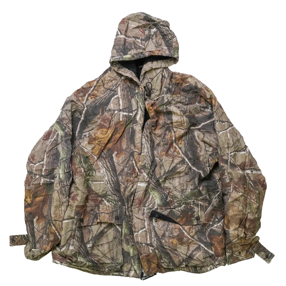 Commercial Realtree camouflage jacket with an attached hood. Features an all-over camo pattern and standard jacket construction.