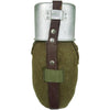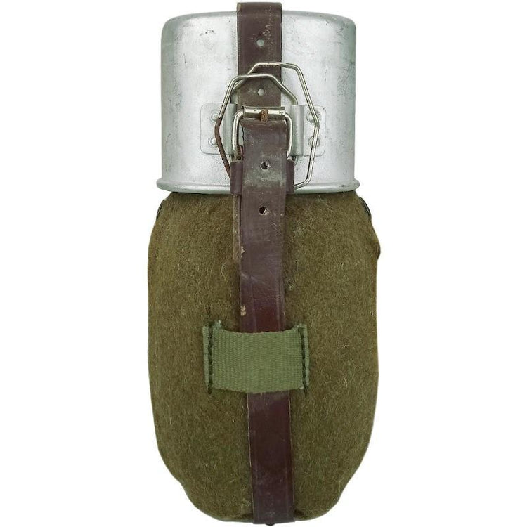 This Romanian canteen and cup duo are similar in design to the German WW2 variant. A single leather strap and buckle secure them together firmly. The cup is equipped with foldout butterfly arms so you can safely hold a hot brew on a cold morning. As for hydration in the heat - the canteen sits snuggly in a felt snap dome pouch. Any excess water the cover absorbs will help keep the aluminum canteens contents cool.