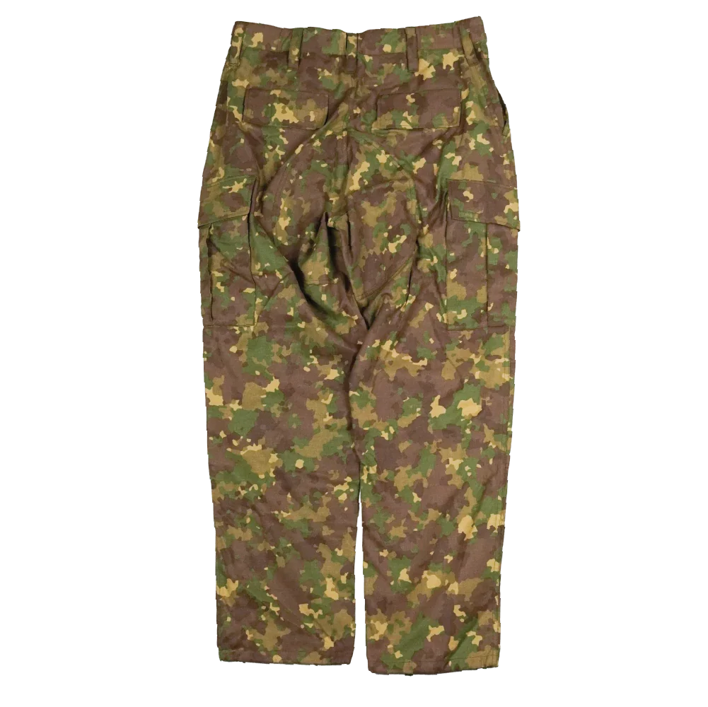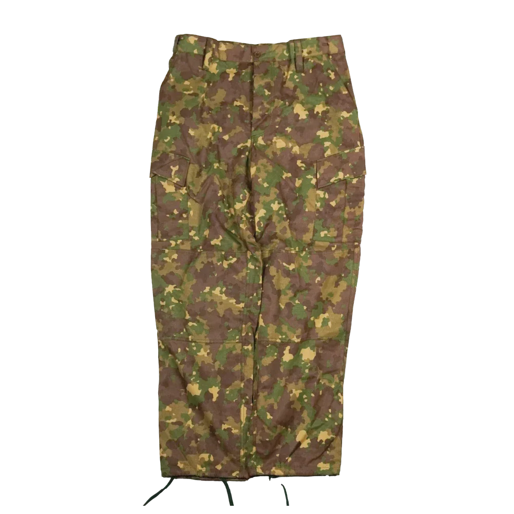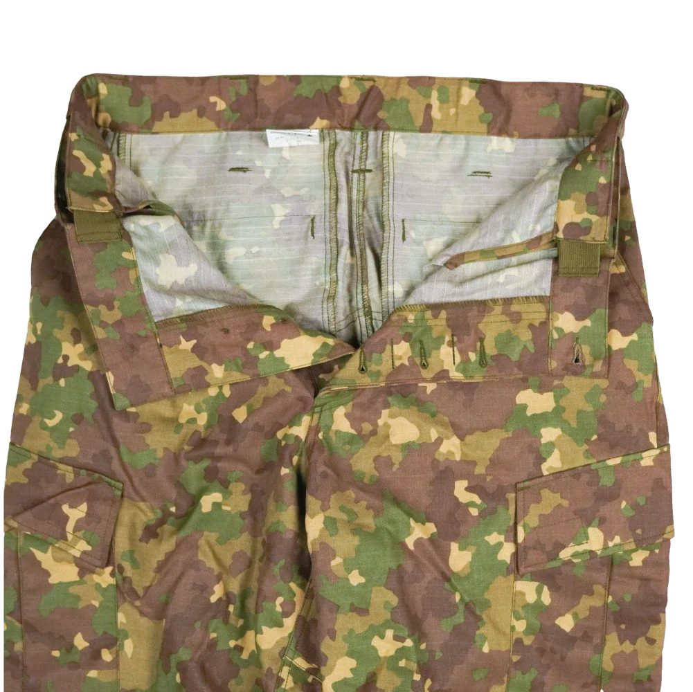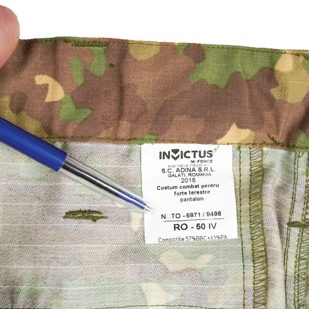 Romanian Army M2017 field trousers. Button-up fly construction with multiple pockets and reinforced areas at the seat and knees. Internal elastic at the waist and drawcord adjustment at the ankles are present.