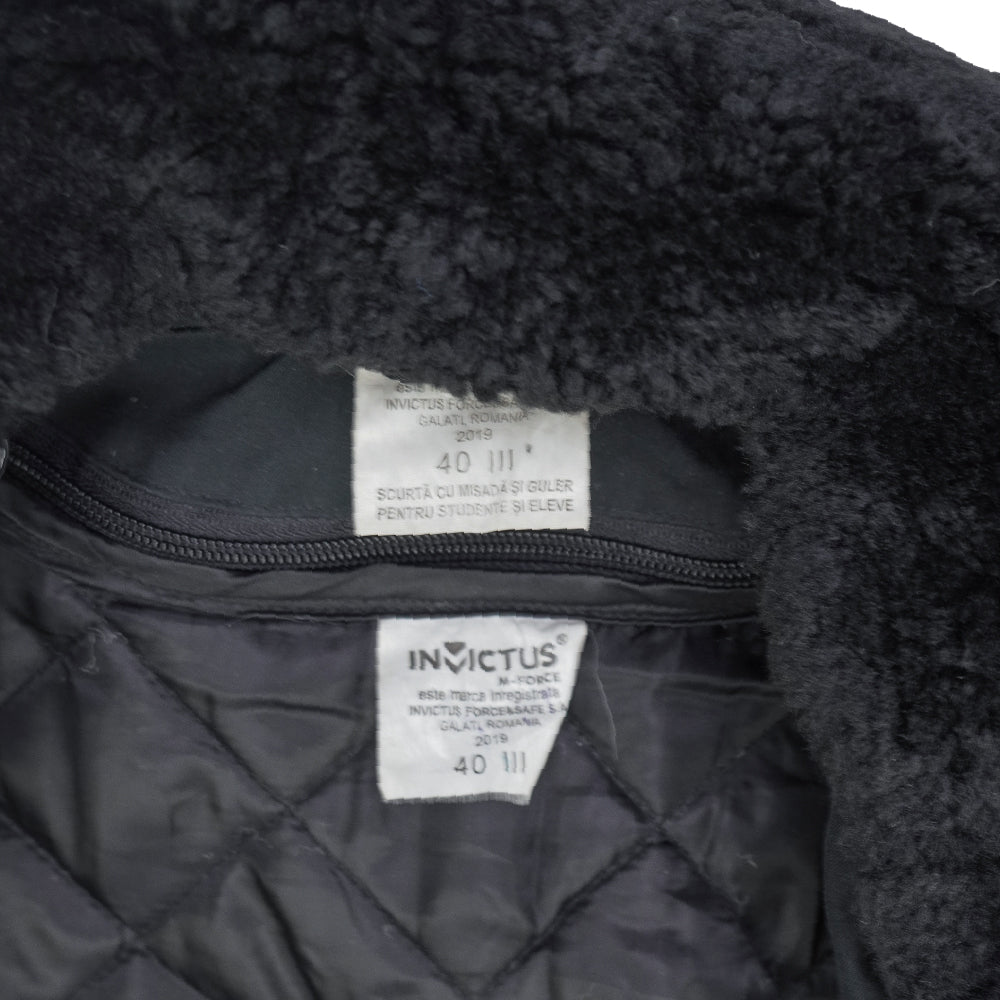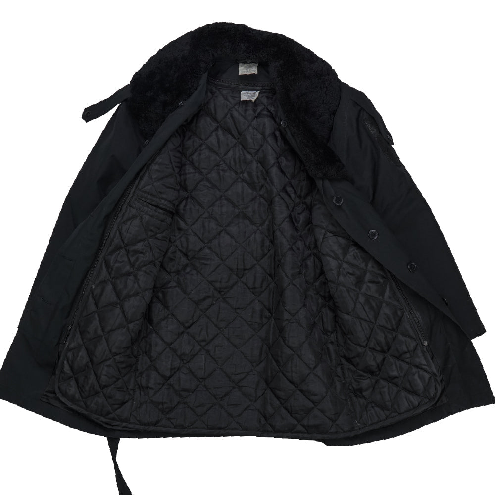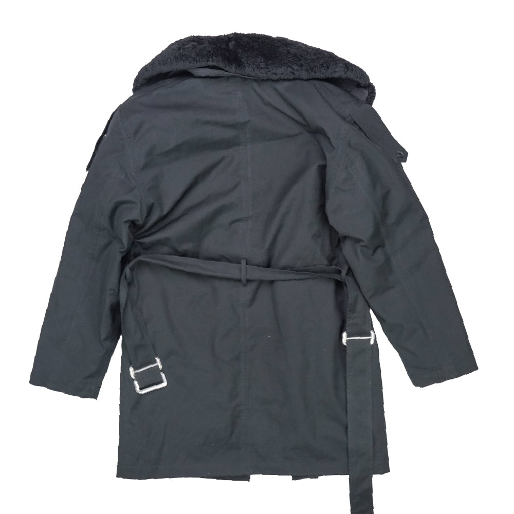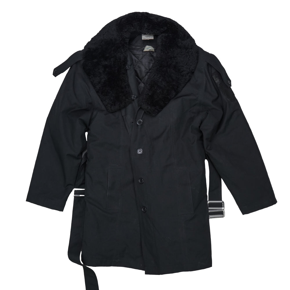 Romanian Naval Academy parka with a black outer shell and quilted interior lining. The coat features a large fur collar, button front closure, and an integrated waist belt with metal buckle hardware.
