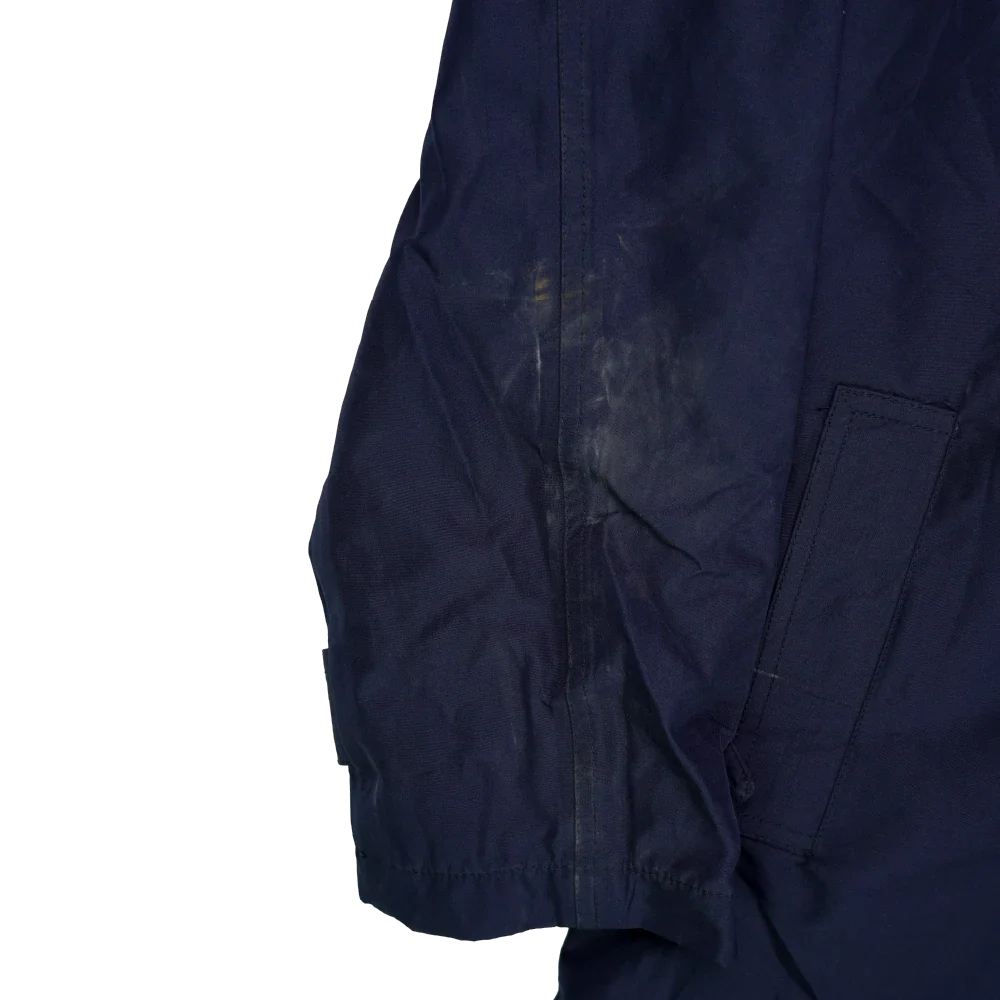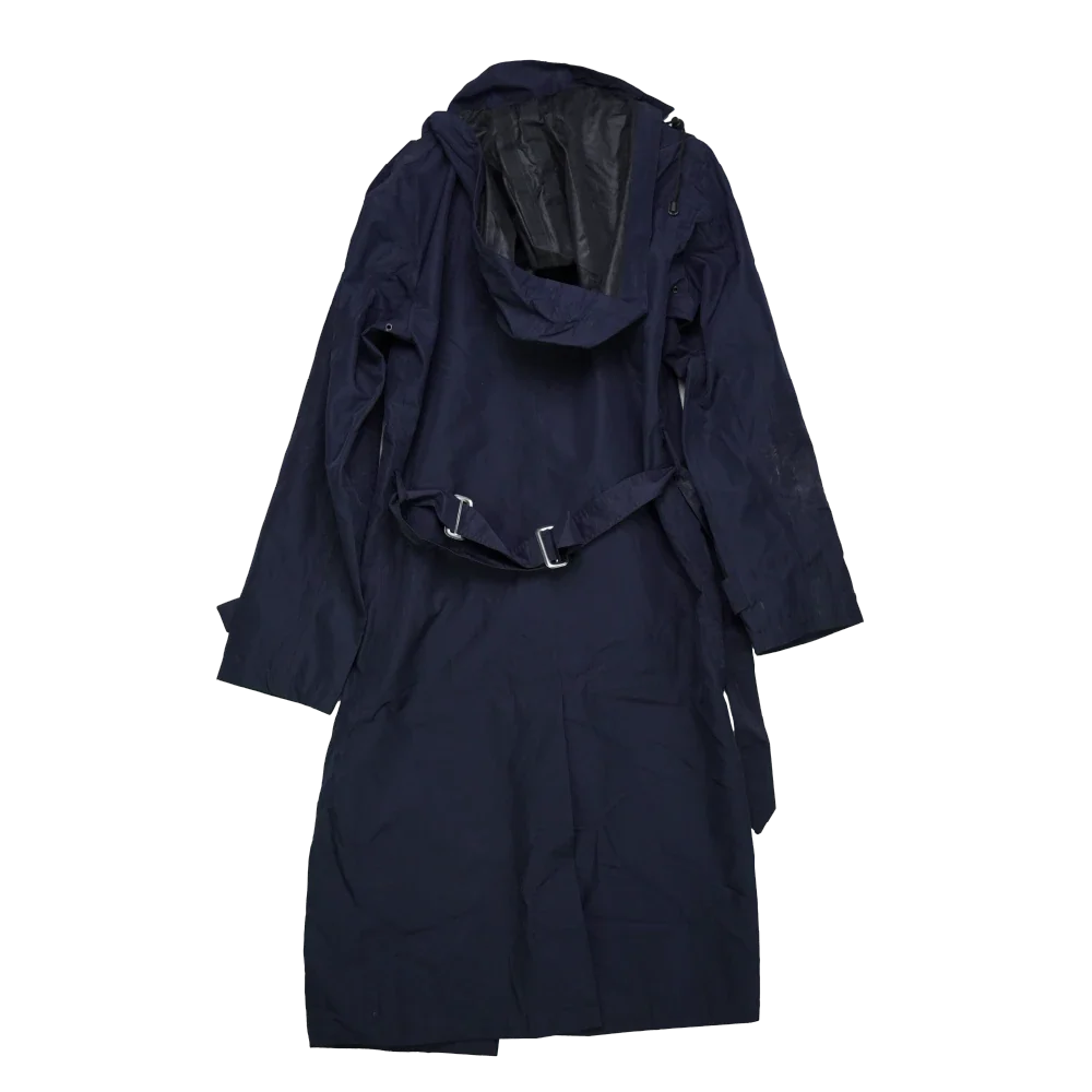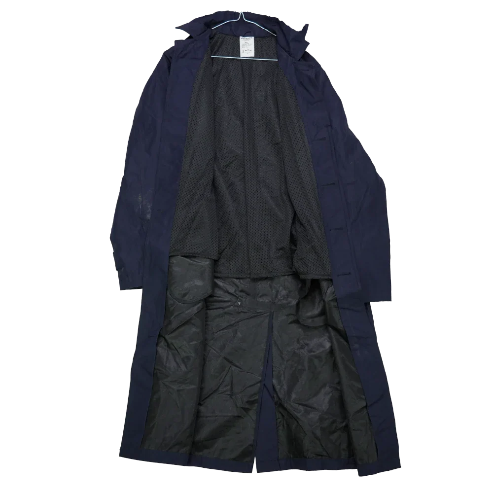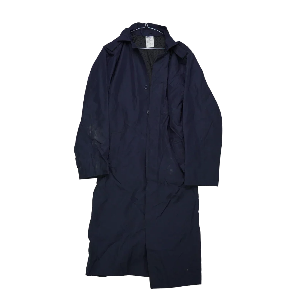 Romanian Navy waterproof trenchcoat in surplus condition. Long cut with a water-resistant outer shell and full-length front closure.